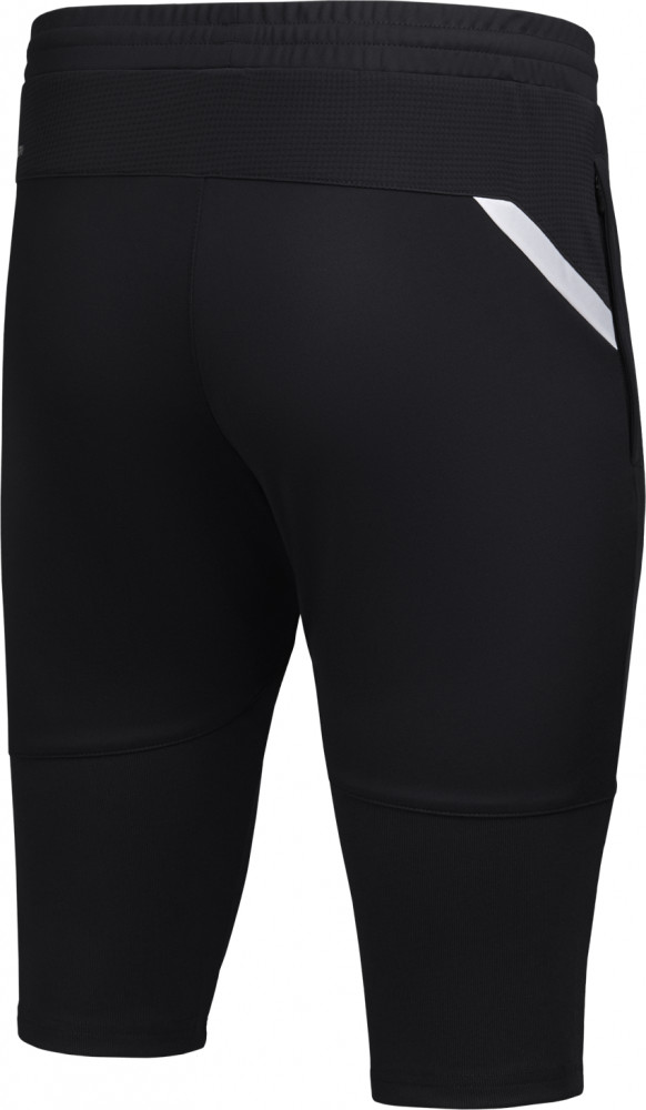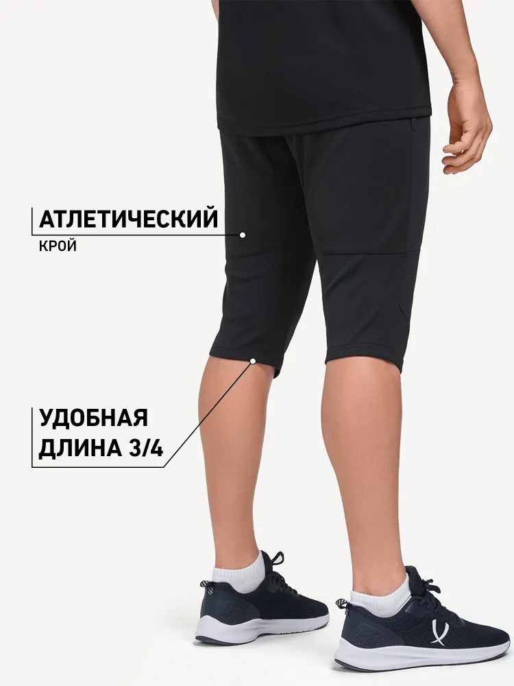 Pro Training Pants 3/4 — спортивные брюки для тренировок любой интенсивности. Модель оптимальна как для профессионалов, так и любителей: продуманный крой с оригинальным дизайнерским решением обеспечит максимальный комфорт. Сочетание трех видов высокотехнологичной ткани учитывает все потребности спортсмена. Сетчатые вставки, расположенные на фигурной кокетке сзади, обеспечивают качественное воздухоотведение в местах, требующих дополнительной вентиляции. Идеальное прилегание достигается использованием рубчатой ткани на задней поверхности брюк, что позволяет спортивным штанам точно подстраиваться под движения тела, а для оптимальной посадки спереди на колене проработано решение в виде вытачек. Основная ткань имеет специальное переплетение Double Weave. Эластичный пояс надежно фиксирует изделие на бедрах при помощи завязок-шнурков, боковые карманы застегиваются на молнию. С левой стороны располагается белый логотип, сделанный из специального силиконового материала по технологии 3D-нанесения.