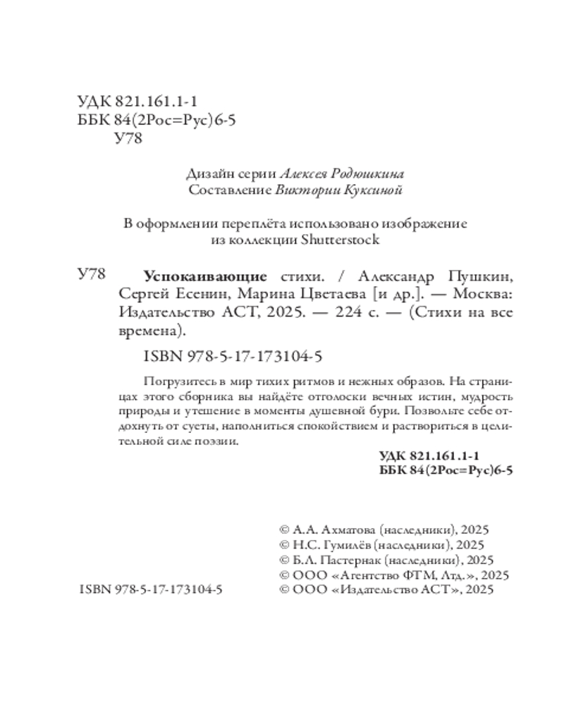 Успокаивающие стихиАлександр Сергеевич Пушкин, Марина Ивановна Цветаева, Сергей Александрович Есенин В данный момент этот товар отсутствует в продаже. Возможно, у нас найдется аналогичный или похожий товар здесь. Серия: Стихи на все времена Погрузитесь в мир тихих ритмов и нежных образов. На страницах этого сборника вы найдёте отголоски вечных истин, мудрость природы и утешение в моменты душевной бури. Позвольте себе отдохнуть от суеты, наполниться спокойствием и раствориться в целительной силе поэзии. |