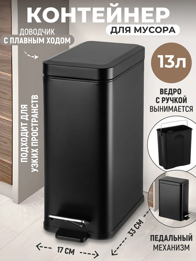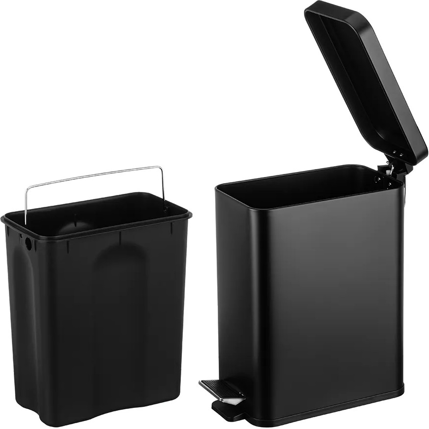 Прямоугольный контейнер для мусора от бренда El Casa предназначен для организации порядка в вашем доме, например, в комнате или на кухне. Имеет матовую поверхность. Урна оснащена крышкой — она не пропустит запахов и не допустит выпадения мусора. Крышка с микролифтом плавно закрывается без резкого звука. Размер изделия — 33.8×17×37.5 см, объём — 13 литров. Внешняя ёмкость белого цвета выполнена из металла, имеет внутри чёрное пластиковое ведро размером 27.5×16×31.5 см. Размер дна ведёрка 24×13 см. Крышечка открывается педальным механизмом. Педаль легко нажать — вам не потребуется прикладывать усилий. Внутреннее и внешнее ведро мусорной корзины оснащены металлическими ручками, благодаря чему каждый элемент будет удобен для переноски. Компактная мусорка отлично послужит вам для уборки и наведения порядка — её легко взять с собой в нужную комнату. Подойдёт для уборки стола и полок, перебирания канцелярии и бумаг. Напольная мусорная корзинка найдёт своё место в любой части вашего дома. Поставьте её под рабочим столом или на кухне под раковиной, чтобы выбрасывать в неё кожуру, остатки еды или бумажные полотенца. Разместите мусорный бачок в туалете возле унитаза для утилизации гигиенических и косметических принадлежностей.
