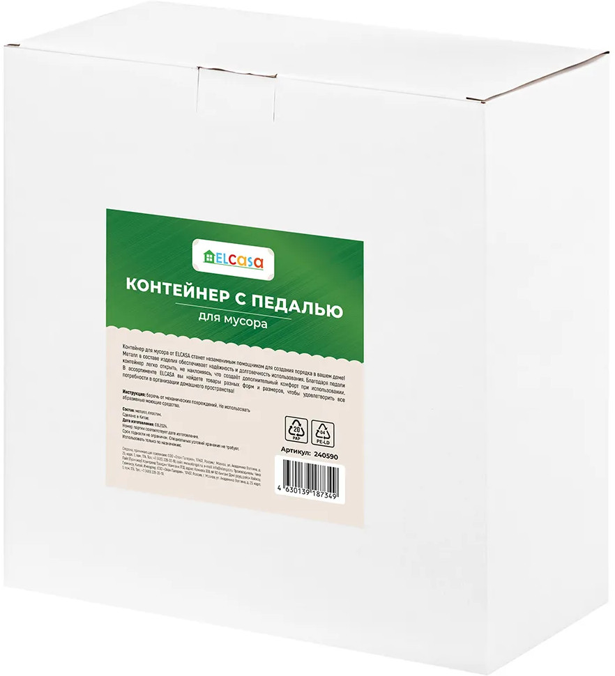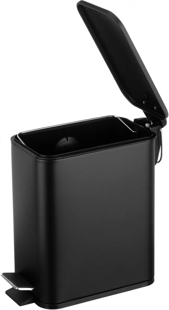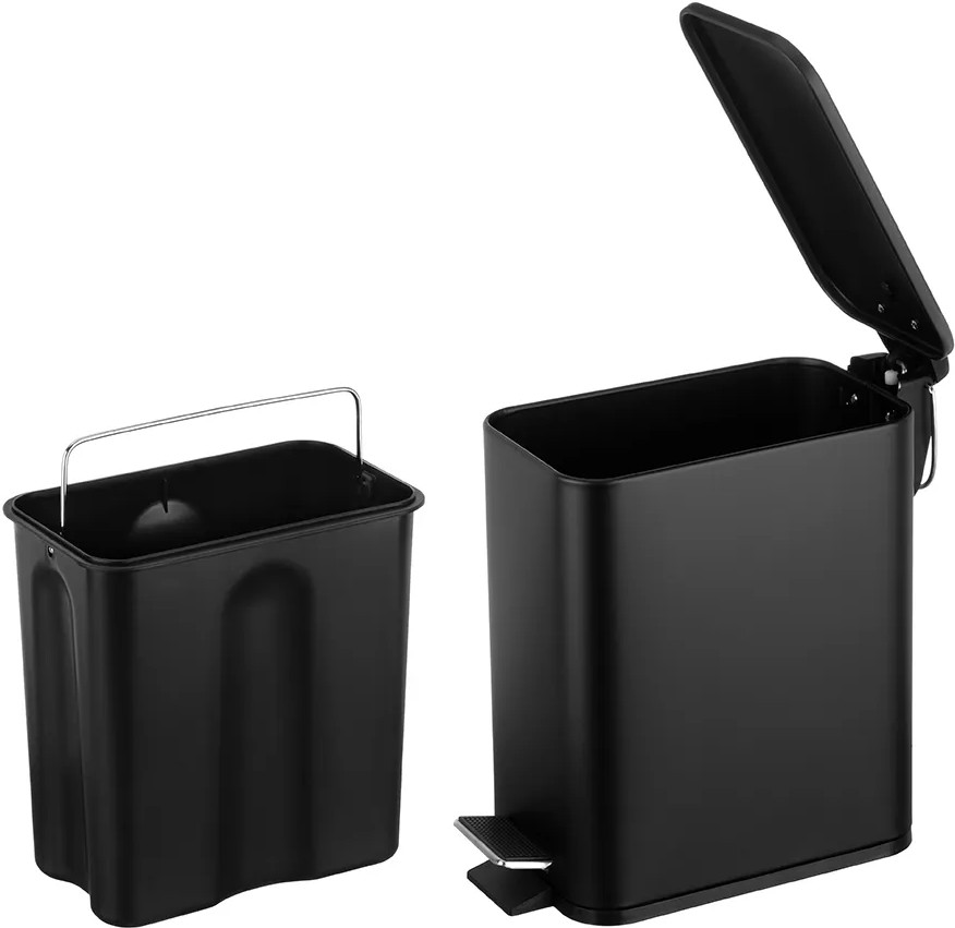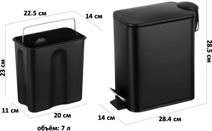 Прямоугольный контейнер для мусора от бренда El Casa предназначен для организации порядка в вашем доме, например, в комнате или на кухне. Имеет матовую поверхность. Урна оснащена крышкой — она не пропустит запахов и не допустит выпадения мусора. Крышка с микролифтом плавно закрывается без резкого звука. Размер изделия — 28.4×14×28.5 см, объём — 7 литров. Внешняя ёмкость чёрного цвета выполнена из металла, имеет внутри чёрное пластиковое ведро размером 22.5×14×23 см. Размер дна ведёрка 20×11.5 см. Крышечка открывается педальным механизмом. Педаль легко нажать — вам не потребуется прикладывать усилий. Внутреннее и внешнее ведро мусорной корзины оснащены металлическими ручками, благодаря чему каждый элемент будет удобен для переноски.