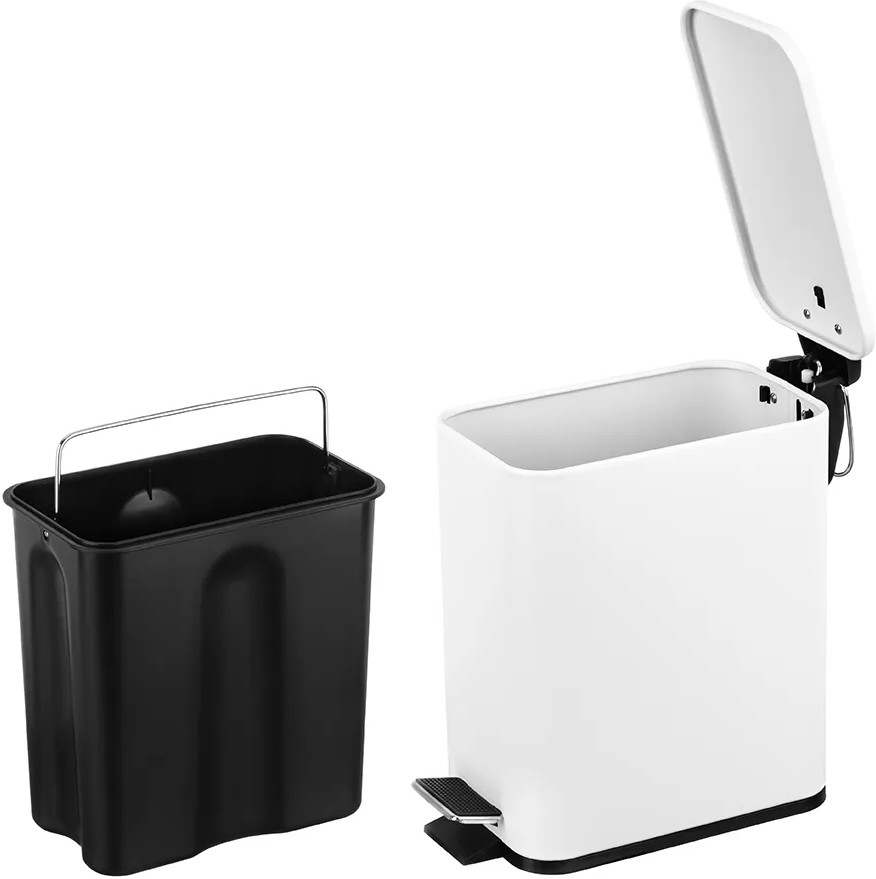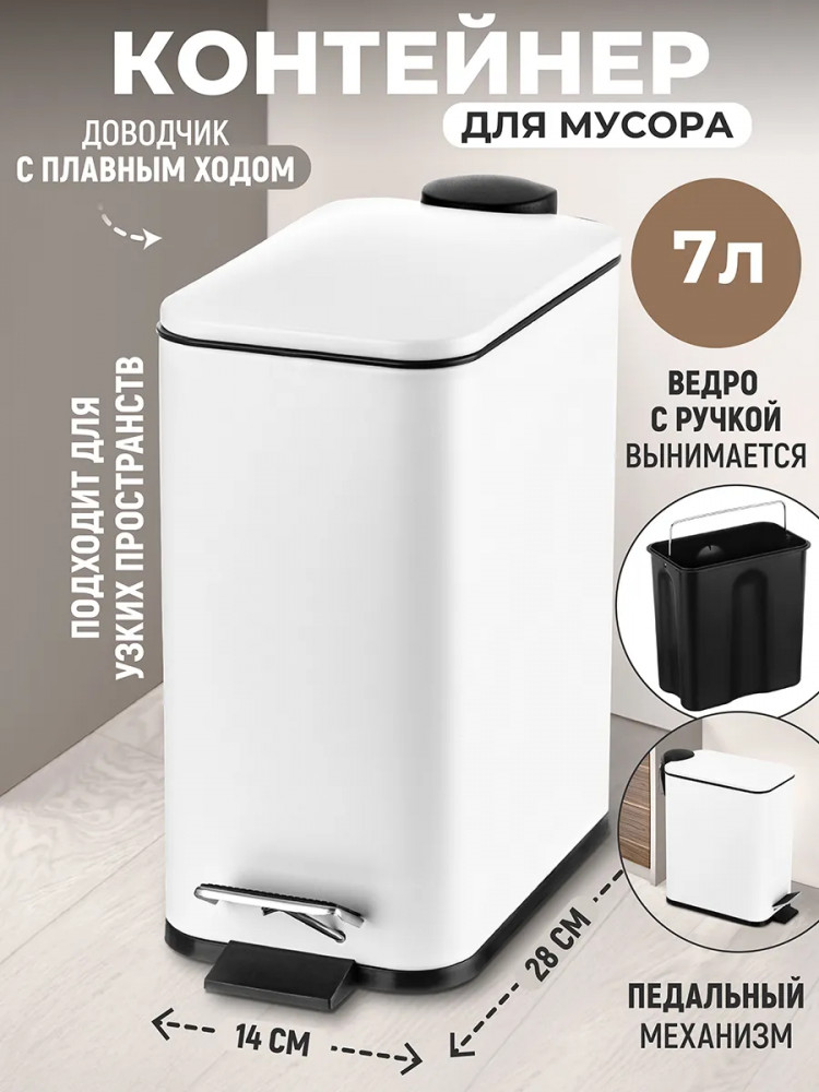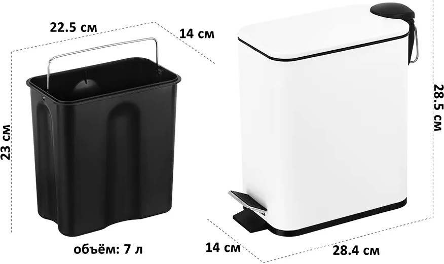 Прямоугольный контейнер для мусора от бренда El Casa предназначен для организации порядка в вашем доме, например, в комнате или на кухне. Имеет матовую поверхность. Урна оснащена крышкой — она не пропустит запахов и не допустит выпадения мусора. Крышка с микролифтом плавно закрывается без резкого звука. Размер изделия — 28.4×14×28.5 см, объём — 7 литров. Внешняя ёмкость чёрного цвета выполнена из металла, имеет внутри чёрное пластиковое ведро размером 22.5×14×23 см. Размер дна ведёрка 20×11.5 см. Крышечка открывается педальным механизмом. Педаль легко нажать — вам не потребуется прикладывать усилий. Внутреннее и внешнее ведро мусорной корзины оснащены металлическими ручками, благодаря чему каждый элемент будет удобен для переноски.