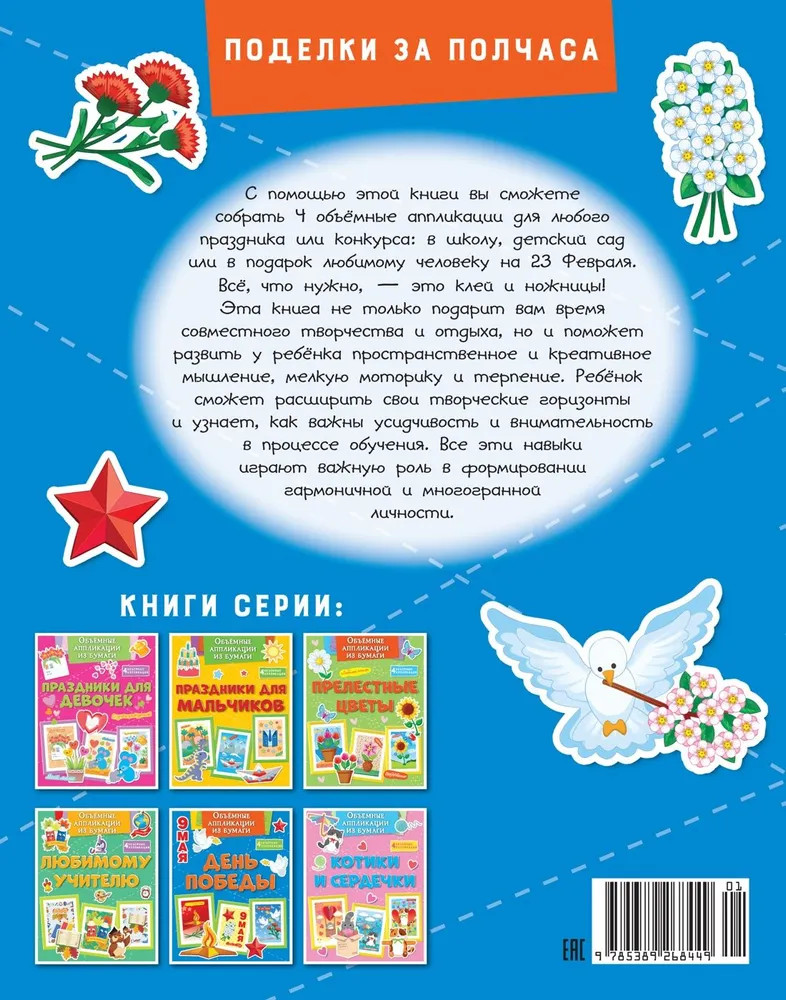 💳 Оплатить за товар можно при получении 🇰🇿 Есть бесплатная доставка по Казахстану от 1 дня 🎁 Копите бонусы с каждой покупки Серия: Поделки за полчаса С помощью этой книги вы сможете собрать 4 объёмные аппликации для любого праздника или конкурса: в школу, детский сад или в подарок. Поделки идеально подойдут для подарка на 9 мая или День Победы, а понятные инструкции сделают процесс лёгким. Всё, что нужно — это клей и ножницы! Эта книга не только обеспечит вам время вместе, но и поможет развить у ребенка пространственное и креативное мышления, мелкую моторику и терпение. Ребёнок сможет расширить свои творческие горизонты и научится важности усидчивости и внимательности в процессе обучения. Все эти навыки играют важную роль в формировании гармоничной и многогранной личности. Серия «Поделки за полчаса» включает множество книг, которые предлагают разнообразные идеи для создания аппликаций, поделок и игрушек с нуля. В каждой книге собраны все необходимые материалы и инструкции, что упрощает процесс творчества и помогает развивать мелкую моторику у детей. |