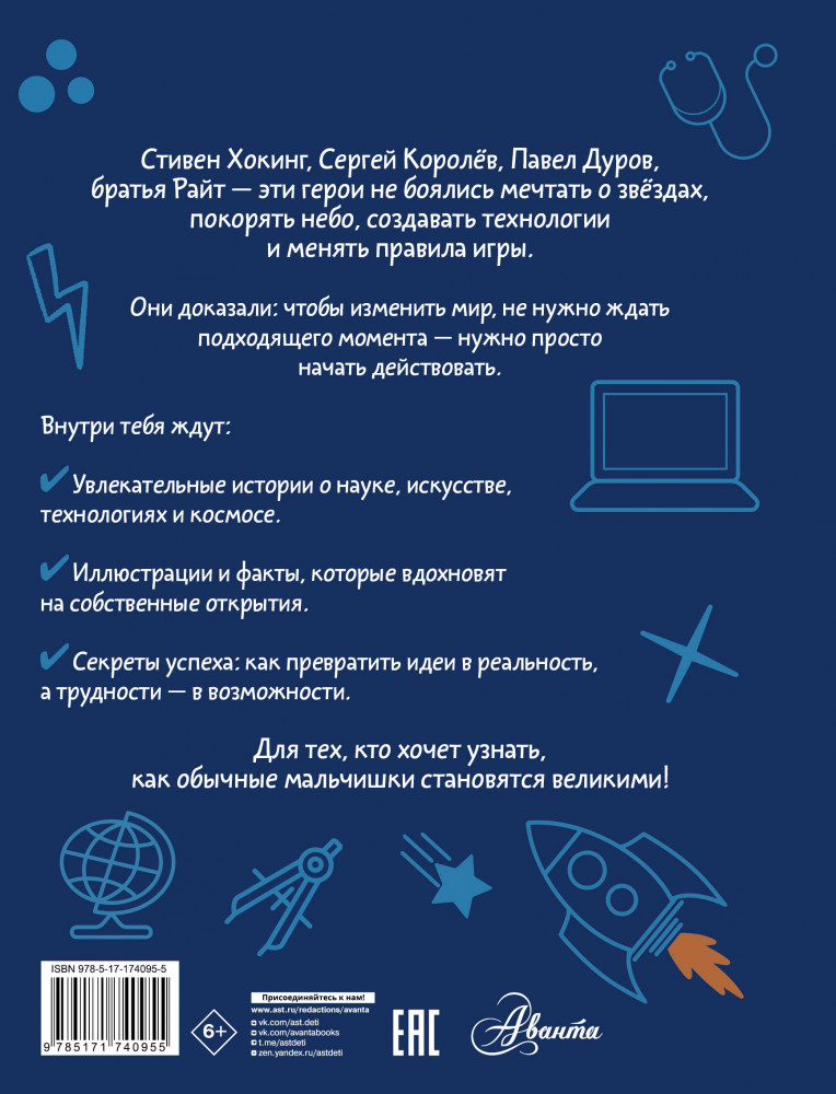 💳 Оплатить за товар можно при получении 🇰🇿 Есть бесплатная доставка по Казахстану от 1 дня 🎁 Копите бонусы с каждой покупки Серия: Истории для настоящих супергероев Эта книга рассказывает о выдающихся мужчинах, чьи идеи, изобретения и творчество оставили неизгладимый след в истории человечества. От науки и искусства до технологий и космоса — герои книги вдохновляют своим упорством, талантом и смелостью. |