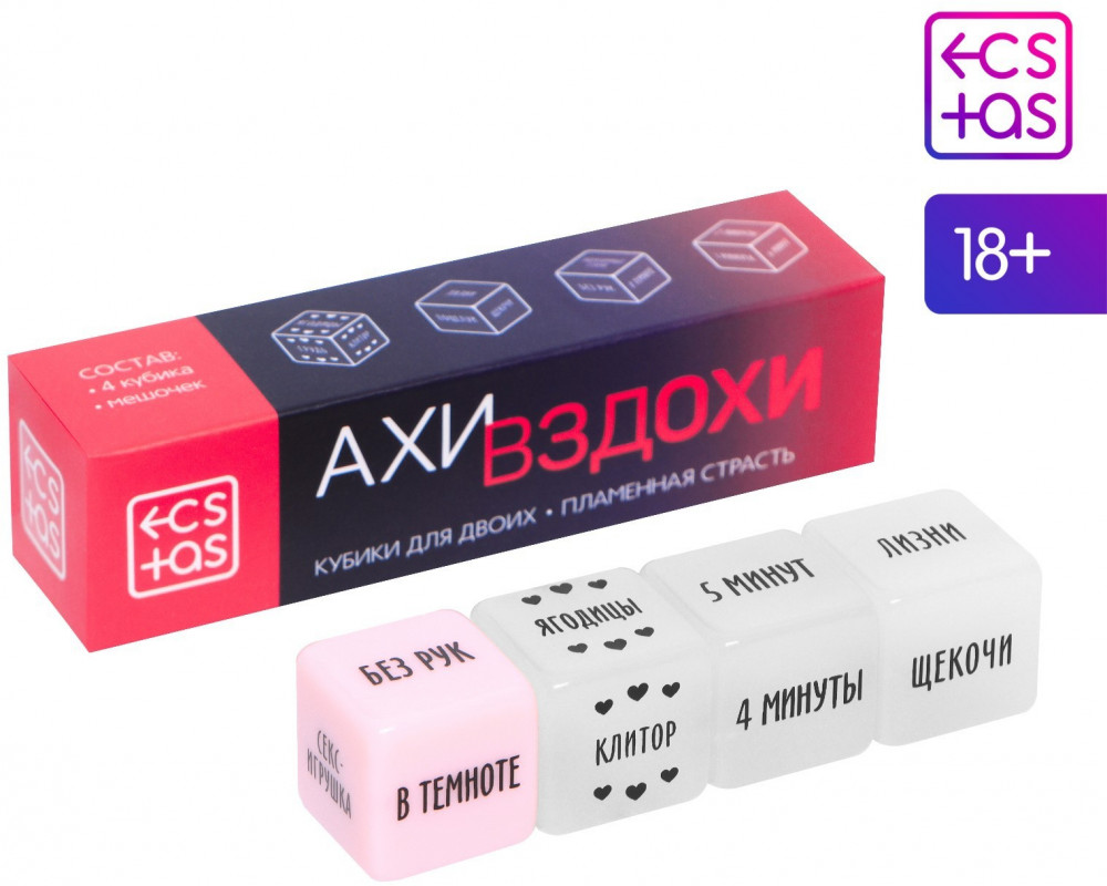 Ecstas Кубики для двоих «Ахи вздохи. Пламенная страсть»В данный момент этот товар отсутствует в продаже. Возможно, у нас найдется аналогичный или похожий товар здесь. Хотите добавить в отношения перчинки? Нужно лишь бросить кубики! Внутри вас ждёт четыре кубика. Один из них подскажет место на теле партнера, второй — что нужно делать, третий — как это делать, а четвертый — время, за которое это нужно сделать. |