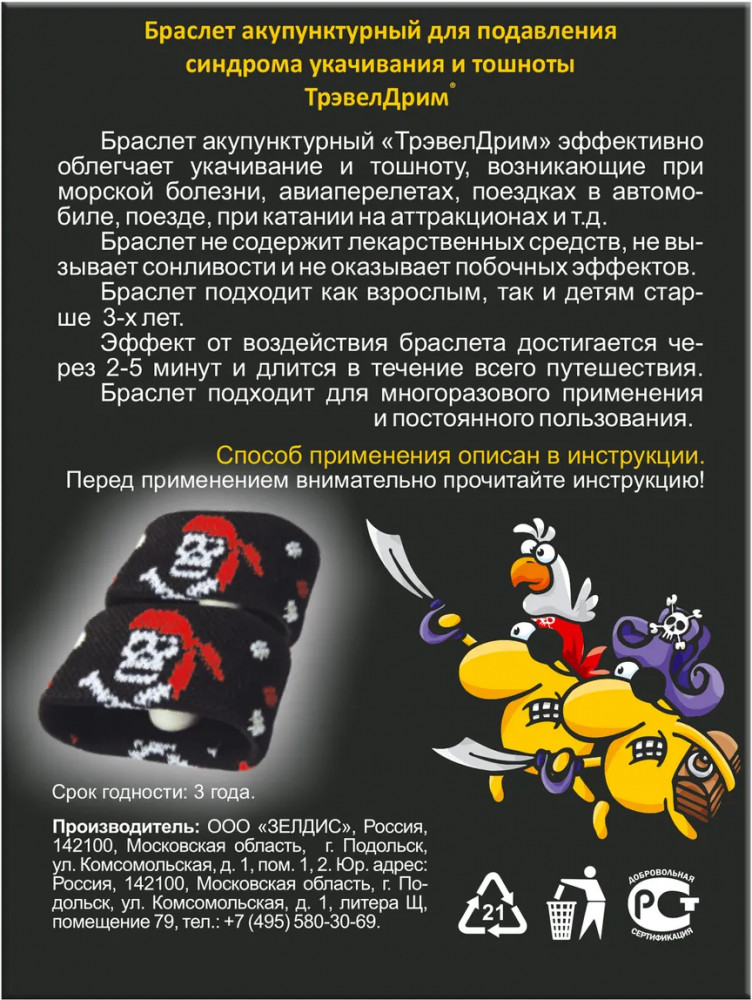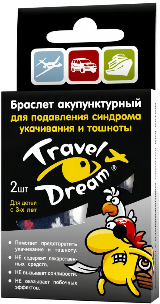 ТрэвелДрим браслет акупунктурный эффективно облегчает укачивание и тошноту, возникающие при морской болезни, авиаперелетах, поездках в автомобиле, поезде, при катании на аттракционах. Рекомендован детям от 3-х лет. Яркие изображения создадут игровую атмосферу в поездке. Не содержит лекарственных средств и не оказывает побочных эффектов. |