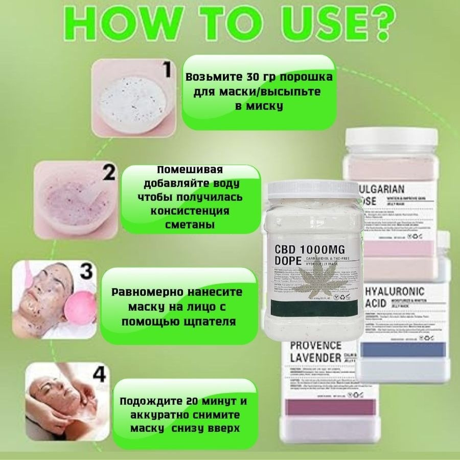 Маска альгинатная, гидрогелиевая, электролитная — CBD 1000 мг «Стоп старость». Маска мгновенного действия. Главная ценность экстракта — уникальный набор жирных кислот, в котором содержатся Омега-3, Омега-6 и редкая Омега-9. CBD — это практически идеальный экстракт для ухода за кожей, который подходит всем типам кожи. Он имеет противовоспалительный эффект, уравновешивает увлажнение кожи и корректирует выработку жира.