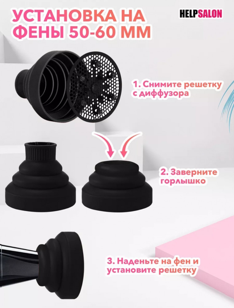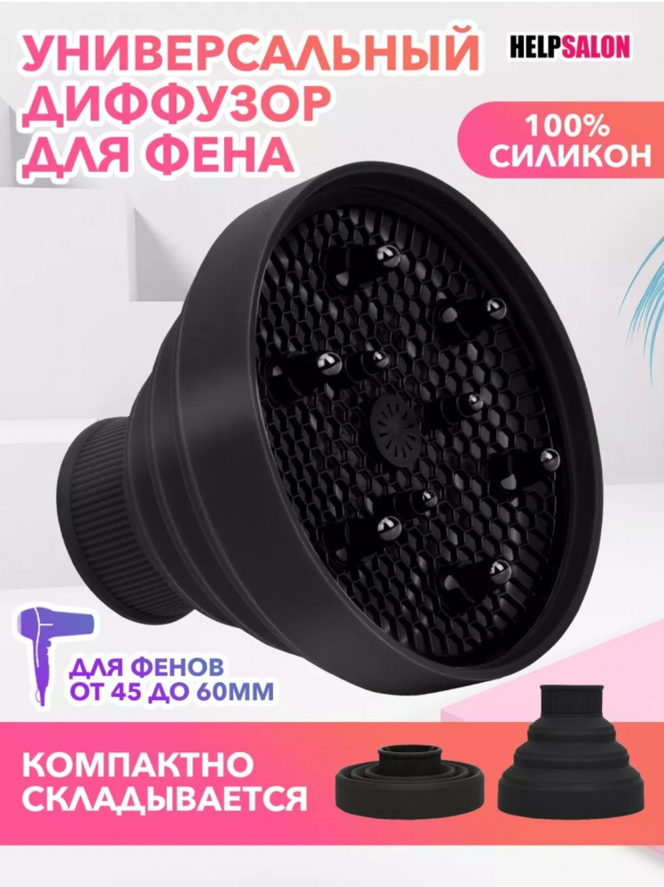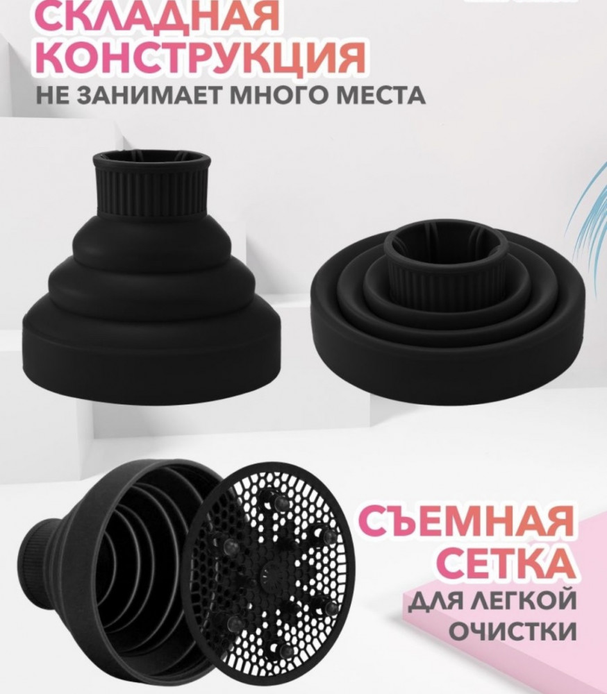 💳 Оплатить за товар можно при получении 🇰🇿 Есть бесплатная доставка по Казахстану от 1 дня 🎁 Копите бонусы с каждой покупки Универсальный диффузор для фенов с соплом шириной от 45 до 55мм. Смотри инструкцию по установке на фото. Диффузор — насадка на фен, идеален для укладки всех типов волос, особенно кудрявых для создания идеальных локонов, тонких и лишенных объема для придания волосам пышности. Складной диффузор для укладки волос изготовлен из прочного термостойкого силикона. За счет равномерного распределения воздуха не повреждает волосы, придает прическе объем без пересушивания вне зависимости от длины и типа волос. «Пальцы» насадки для сушки рассеивают горячий воздух на множество направленных струй. |