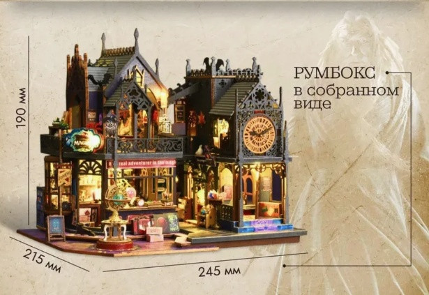 В комплекте: инструменты для сборки, музыкальный механизм, клей, подстветка/. Этот конструктор включает в себя все необходимые элементы интерьера: мебель, предметы декора и освещение. Сборная модель выполнена из дерева, текстиля и пластика, что делает её максимально реалистичной и привлекательной для детей старше 8 лет.