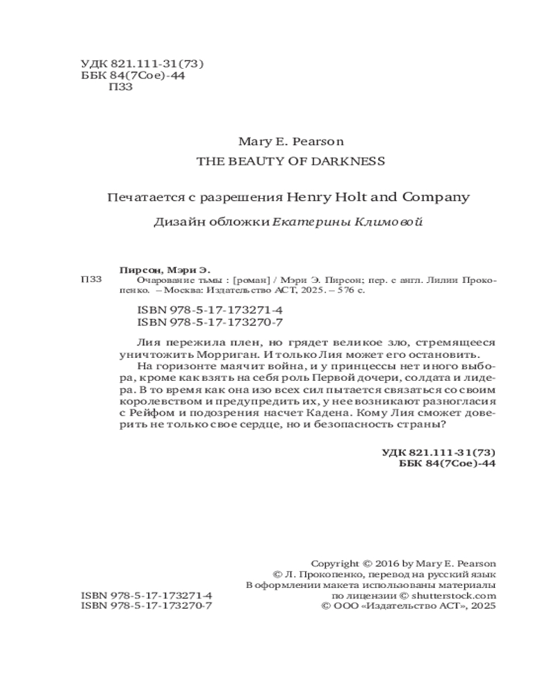 💳 Оплатить за товар можно при получении 🇰🇿 Есть бесплатная доставка по Казахстану от 1 дня 🎁 Копите бонусы с каждой покупки Серия: Mainstream. Фэнтези Лия пережила плен, но грядет великое зло, стремящееся уничтожить Морриган. И только Лия может его остановить. На горизонте маячит война, и у принцессы нет иного выбора, кроме как взять на себя роль Первой дочери, солдата и лидера. В то время как она изо всех сил пытается связаться со своим королевством и предупредить их, у нее возникают разногласия с Рейфом и подозрения кна счет Кадена. Кому Лия сможет доверить не только свое сердце, но и безопасность страны? |