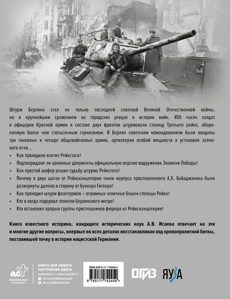 💳 Оплатить за товар можно при получении 🇰🇿 Есть бесплатная доставка по Казахстану от 1 дня 🎁 Копите бонусы с каждой покупки Серия: История Великой Победы. Подарочная энциклопедия Штурм Берлина стал не только последней схваткой Великой Отечественной войны, но и крупнейшим сражением на городских улицах в истории войн. 450 тысяч солдат и офицеров Красной армии в составе двух фронтов штурмовали столицу Третьего рейха, обороняемую более чем стотысячным гарнизоном. В Берлин советским командованием были введены три танковые и четыре общевойсковые армии, артиллерия особой мощности и установки залпового огня... |