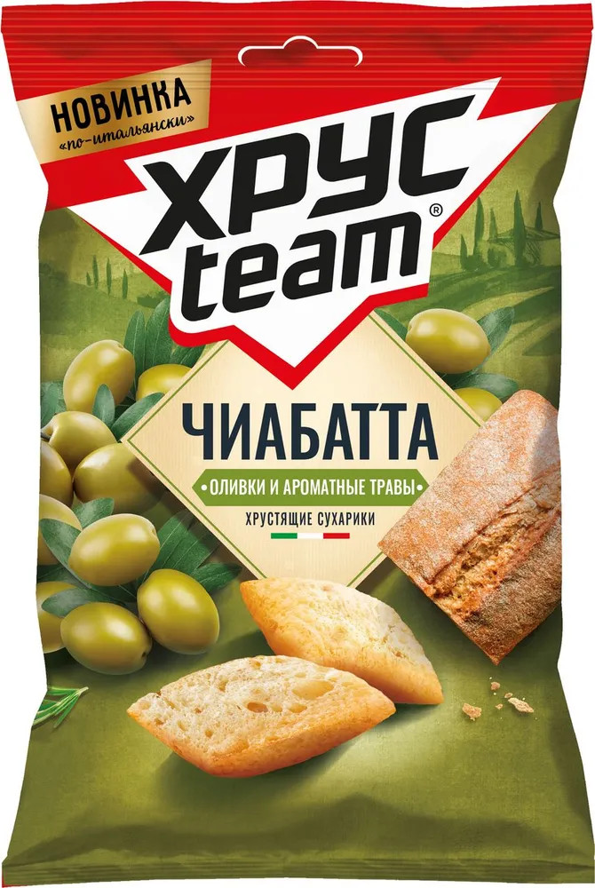 ХрусTeam «Чиабатта» со вкусом «Оливки и ароматные травы» — воздушные сухарики, с текстурой чиабатты, со вкусом нежных оливок и ароматных трав. Яркий вкус оливок и нотки ароматных трав превосходно сочетается с хрустящей брускеттой.