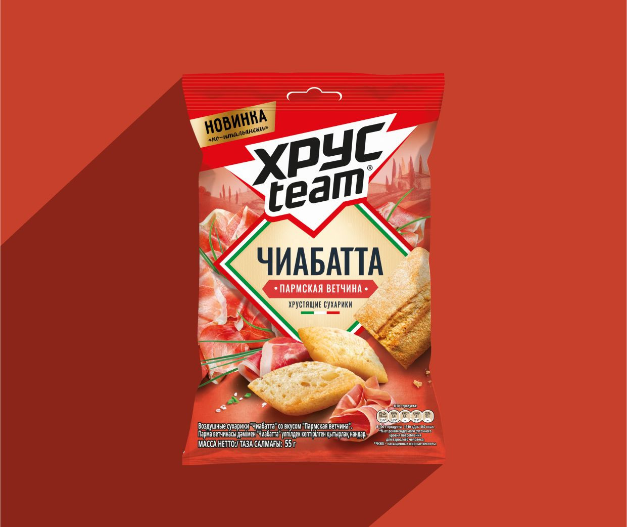 ХрусTeam «Чиабатта» со вкусом «Пармская ветчина» — сухарики с воздушной текстурой чиабатты и неповторимыми итальянскими вкусовыми нотками. Вкус традиционного мясного деликатеса превосходно дополняет хрустящую брускетту.