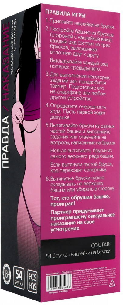 💳 Оплатить за товар можно при получении 🇰🇿 Есть бесплатная доставка по Казахстану 🎁 Копите бонусы с каждой покупки Серия: Новая классика Правда или сексуальное наказание! Хотите провести время вдвоём, да ещё так, чтобы вечер прошёл незабываемо? Постройте башню из брусков. Вытягивайте бруски из разных частей башни и выполняйте задания или отвечайте на вопросы, написанные на брусках. Тот, кто обрушил башню, проиграл! Партнёр придумывает проигравшему сексуальное наказание на своё усмотрение. |