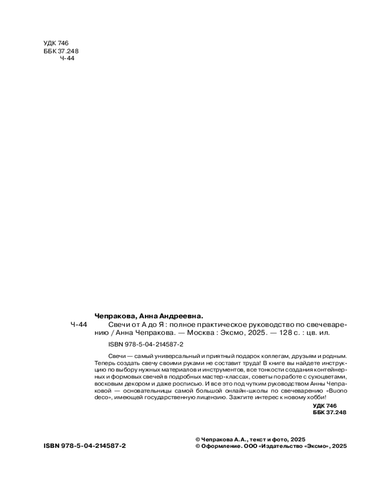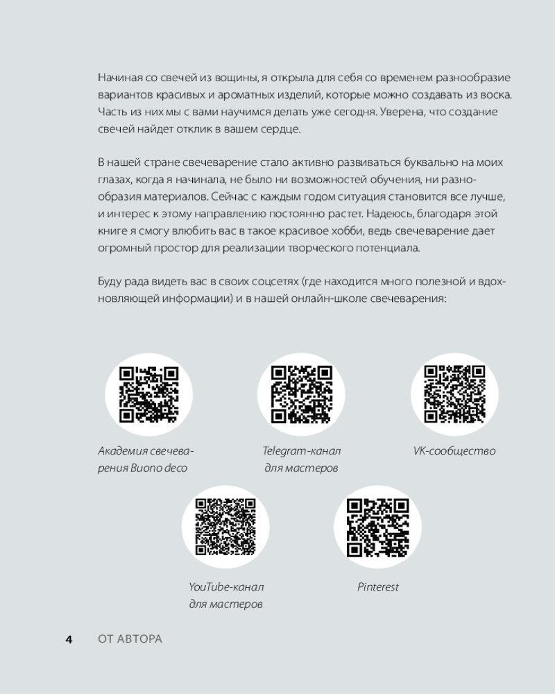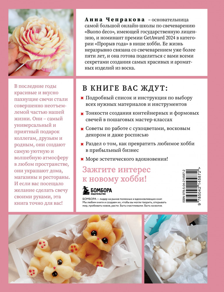 Свечи от А до Я. Полное практическое руководство по свечеварениюВ данный момент этот товар отсутствует в продаже. Возможно, у нас найдется аналогичный или похожий товар здесь. Серия: Высшая лига рукоделия. Самоучители Найдите новое ароматное хобби! В последние годы красивые и вкусно пахнущие свечи стали совершенно неотъемлемой частью нашей жизни. Они — самый универсальный и приятный подарок коллегам, друзьям и родным, они создают самую уютную и волшебную атмосферу в любом пространстве, они украшают дома, магазины и рестораны. И если вас посещало желание сделать свечу своими руками, эта книга точно для вас! |