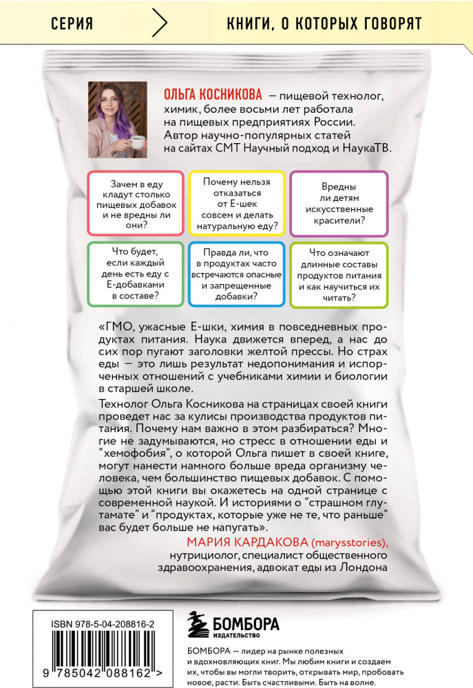 💳 Оплатить за товар можно при получении 🇰🇿 Есть бесплатная доставка по Казахстану от 1 дня 🎁 Копите бонусы с каждой покупки Серия: Книги, о которых говорят Что скрывает от вас ваша любимая шоколадка и о чем молчит йогурт со вкусом персика? Вокруг пищевых добавок сложился зловещий ореол, в то время как об их реальных свойствах мало кто знает. Безликий индекс из букв и цифр ни о чем не говорит обычному покупателю, а ГМО, Е-шки, глутамат и прочие добавки ассоциируются с чем-то небезопасным и ненатуральным, «химическим». Но, может, не так страшна химия, как ее малюют? |