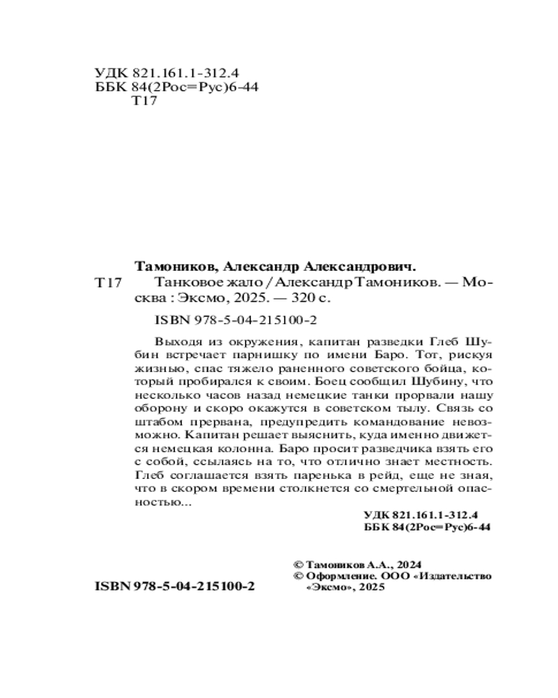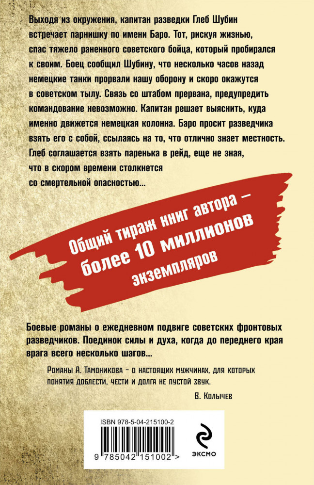 💳 Оплатить за товар можно при получении 🇰🇿 Есть бесплатная доставка по Казахстану от 1 дня 🎁 Копите бонусы с каждой покупки Серия: Фронтовая разведка 41-го. Боевая проза Тамоникова (обложка) Боевые романы о ежедневном подвиге советских фронтовых разведчиков. Поединок силы и духа, когда до переднего края врага всего несколько шагов. Подробности жестоких боев, о которых не рассказывают даже ветераны — участники тех событий. |