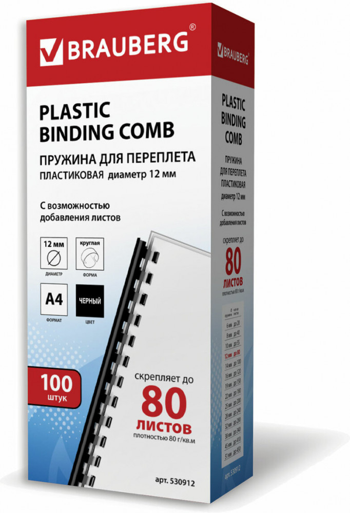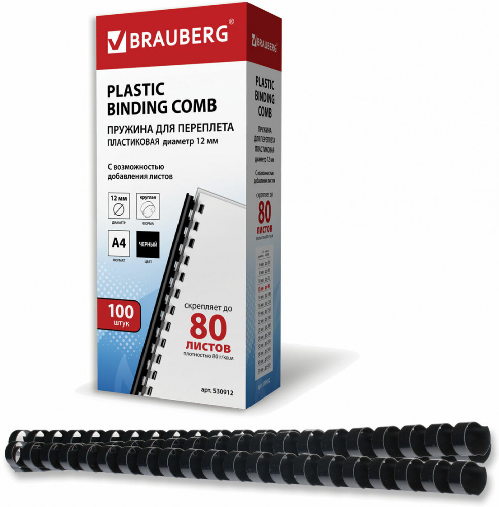 Пластиковая пружина для переплета документов Brauberg совместима с большинством переплетных машин. Преимуществом является возможность быстро извлечь документы из переплета или добавить листы в уже переплетенный документ. Рекомендуется использовать для переплета документов объемом от 56 до 80 листов. Изготовлена из высококачественного пластика чёрного цвета. Состоит из 21 кольца диаметром 12 мм. В упаковке 100 штук. Приобретайте пластиковые пружины для переплета Brauberg для архивации документов и оцените сами их высокое качество и удобство в использовании!  |
