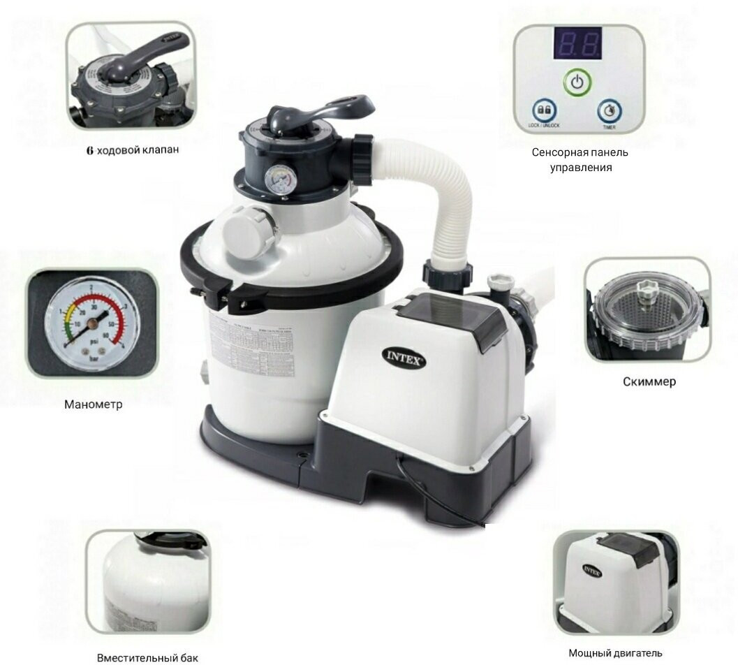 Intex Фильтр-насос песочный для бассейнаВ данный момент этот товар отсутствует в продаже. Возможно, у нас найдется аналогичный или похожий товар здесь. Песочный насос-фильтр Intex 26644 Sand Filter Pump подходит к бассейнам диаметром от 305 см и до 457 см, а также прямоугольным бассейнам размером до 549 на 274 см. Песочные насос — фильтры требуют минимального обслуживания. Песок необходимо менять один раз в несколько лет. По сравнению с обычными фильтрующими насосами, использующими сменные фильтры- картриджи и обеспечивающими слабую очистку воды, песочные фильтры очищают воду в 4 раза эффективнее. Насос имеет 6 режимов работы и встроенный 24-часовой таймер, подключается к штатным отверстиям бассейна при помощи двух гофрированных шлангов. |