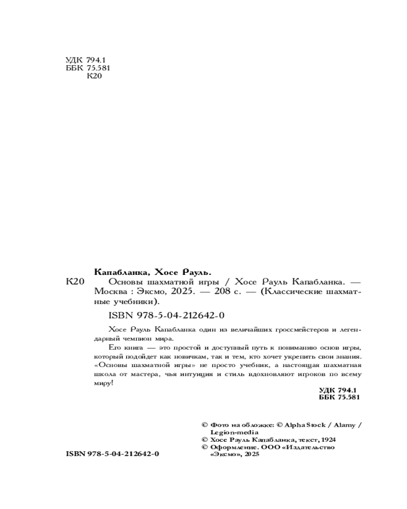 💳 Оплатить за товар можно при получении 🇰🇿 Есть бесплатная доставка по Казахстану от 1 дня 🎁 Копите бонусы с каждой покупки Серия: Классические шахматные учебники Хосе Рауль Капабланка — один из величайших гроссмейстеров и легендарный чемпион мира. Его книга — это простой и доступный путь к пониманию основ игры, который подойдет как новичкам, так и тем, кто хочет укрепить свои знания. «Основы шахматной игры» не просто учебник, а настоящая шахматная школа от мастера, чья интуиция и стиль вдохновляют игроков по всему миру! |