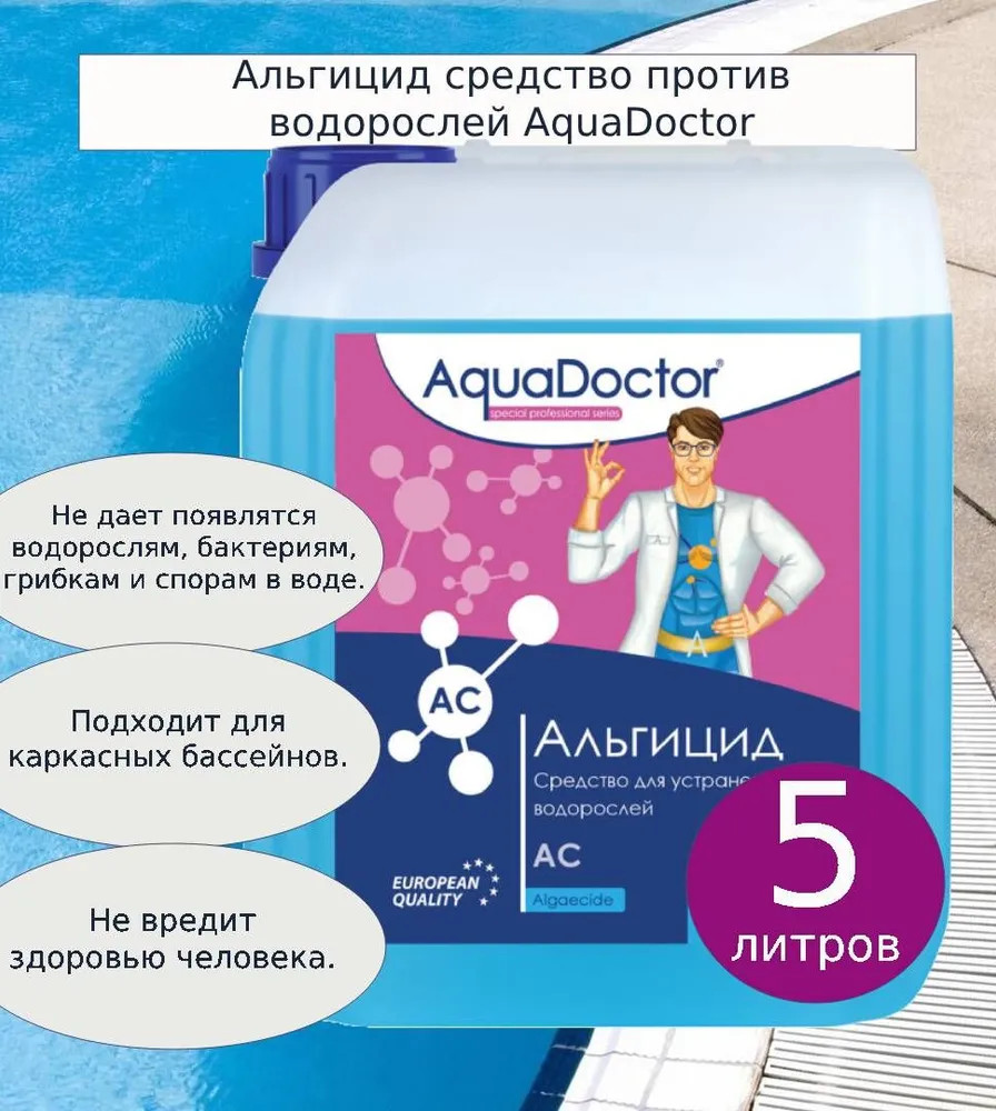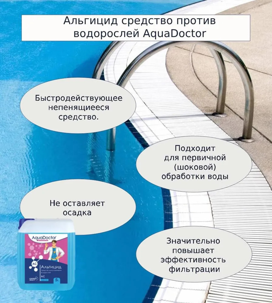 AquaDoctor АС – жидкое непенящееся средство для устранения водорослей в воде бассейна. Используется для проведения ударной и регулярной обработки воды. Препарат обладает мощными бактерицидными, противогрибковыми и противоводорослевыми свойствами. Альгицид AquaDoctor AC дозируется при помощи автоматических станций дозирования химии. Также может применяться для дозирования в ручном режиме.