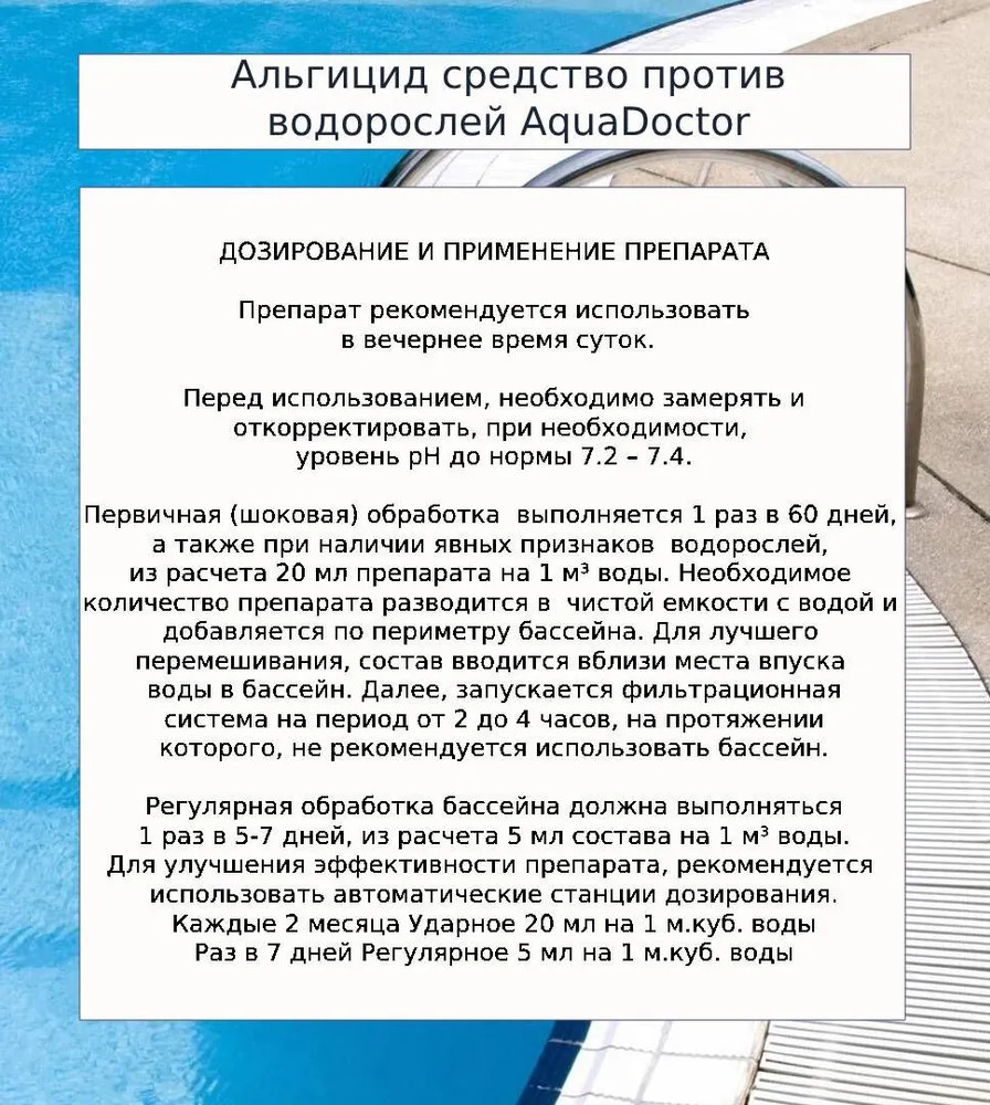 • регулярная обработка: раз в 5-7 дней добавлять в воду бассейна 5 мл. на каждые 1 м3 воды. При интенсивной эксплуатации, после осадков, высокой температуре воды в бассейне требуются более частые обработки или увеличение дозы вплоть до двойного объема.