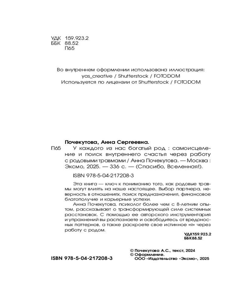 💳 Оплатить за товар можно при получении 🇰🇿 Есть бесплатная доставка по Казахстану от 1 дня 🎁 Копите бонусы с каждой покупки Серия: Спасибо, Вселенная! Ваша жизнь определяется вашим родом. Его изучение — ключ к пониманию того, как родовые травмы могут влиять на наше настоящее. Так считает Анна Почекутова — психолог и специалист системы расстановок. |