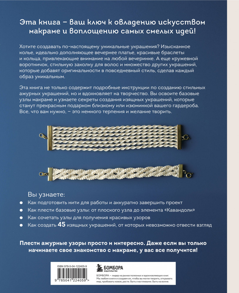 💳 Оплатить за товар можно при получении 🇰🇿 Есть бесплатная доставка по Казахстану от 1 дня 🎁 Копите бонусы с каждой покупки Серия: Звезды рукоделия. Бестселлер из Японии Овладейте искусством макраме и сплетите уникальные ажурные украшения! Изысканное колье, идеально дополняющее вечернее платье, утонченные браслеты, кружевной воротничок, стильные заколки и множество других волшебных аксессуаров сделают ваши образы уникальными и запоминающимися. Вас ждут подробные инструкции по плетению 45 удивительных проектов в технике макраме. Справятся даже новички! Освойте базовые узлы и узнайте секреты создания изящных украшений, которые станут прекрасным подарком близкому или изюминкой вашего гардероба. |