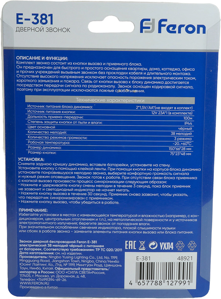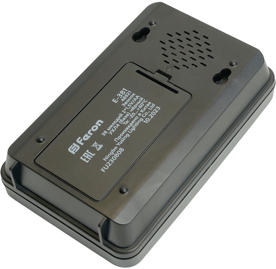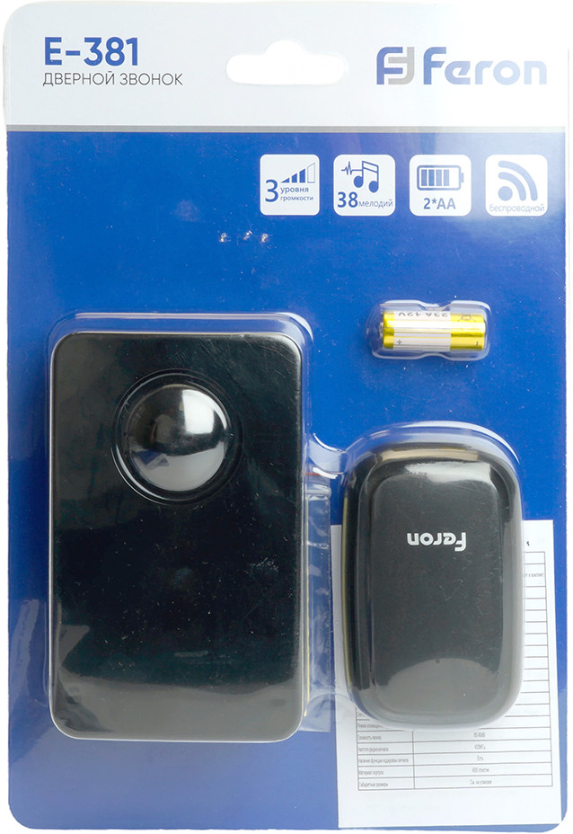 💳 Оплатить за товар можно при получении 🇰🇿 Есть бесплатная доставка по Казахстану 🎁 Копите бонусы с каждой покупки Беспроводной дверной звонок Feron E-381 с кодировкой сигнала исключает ложные срабатывания звонка при нажатии на кнопку другого звонка, установленного поблизости. Звонок работает от батареек, стильный и удобный в применении — достаточно закрепить кнопку двусторонним скотчем на стене перед входной дверью, а основной механизм можно разместить в помещении. Сферы применения: наиболее часто применяются в жилых многоквартирных домах, но также могут использоваться в офисных помещенияъх в качестве устройства оповещения о посетителе. |