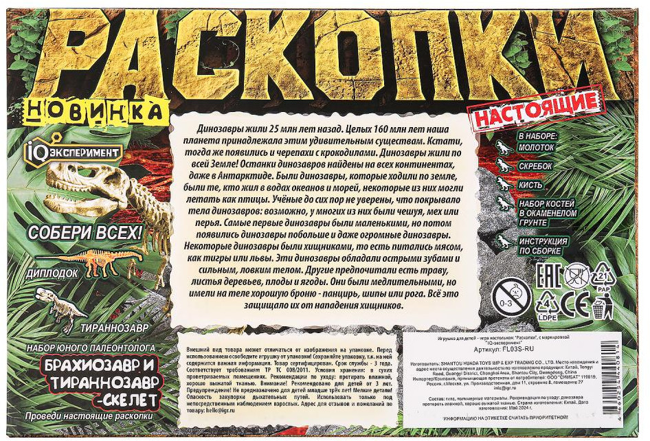 💳 Оплатить за товар можно при получении 🇰🇿 Есть бесплатная доставка по Казахстану от 1 дня 🎁 Копите бонусы с каждой покупки Серия: Настоящие раскопки Игровой набор «Настоящие раскопки» ТМ «IQ эксперимент» непременно понравится юным палеонтологам. Юному палеонтологу предстоит принять участие в настоящих раскопках: он будет самостоятельно откалывать гипс, извлекать и очищать скелеты динозавров, используя специальные инструменты. А после раскопок ребёнок сможет использовать получившиеся модели в своих играх или в качестве части коллекции — серия представлена несколькими видами древних ящеров. Игра с набором раскопок ТМ «IQ эксперимент» развивает: логику, моторику, внимание, усидчивость, аккуратность, воображение и фантазию. |