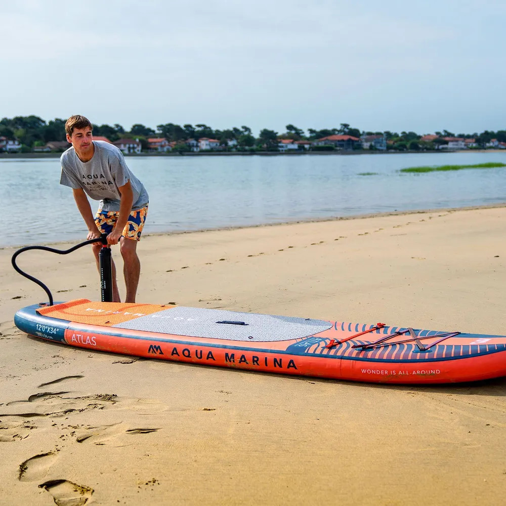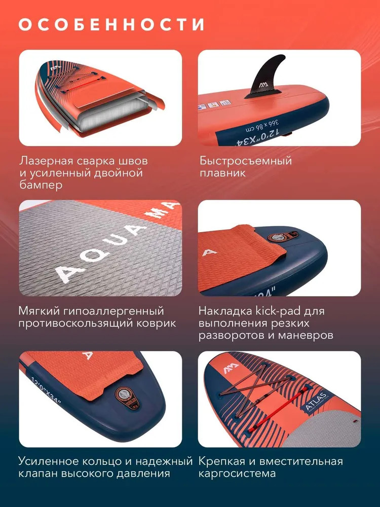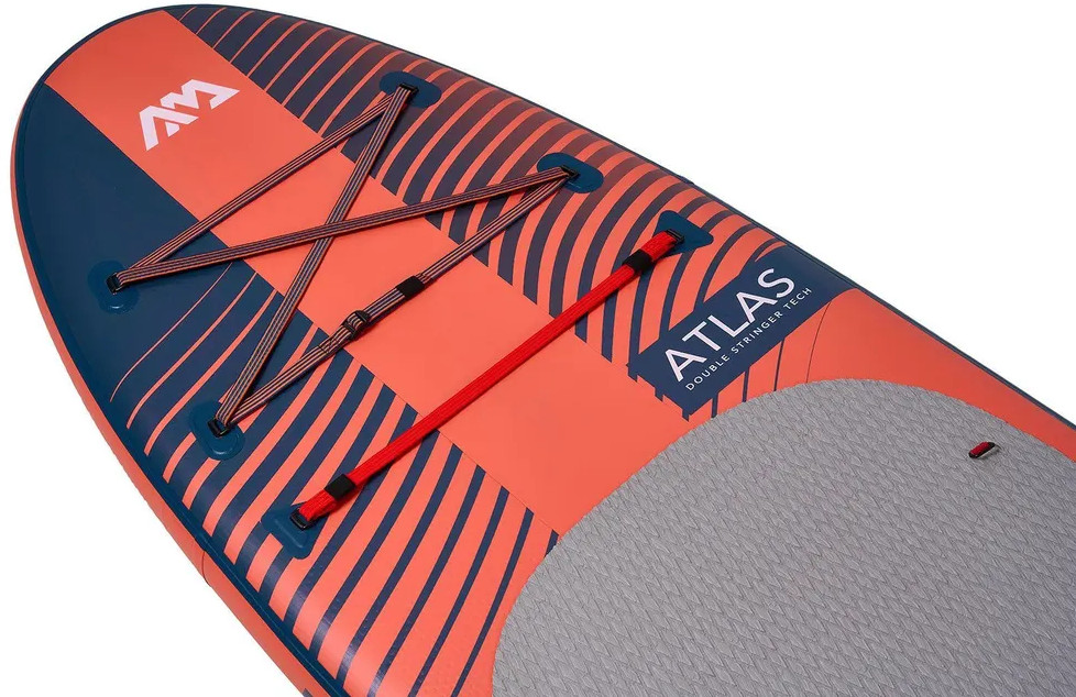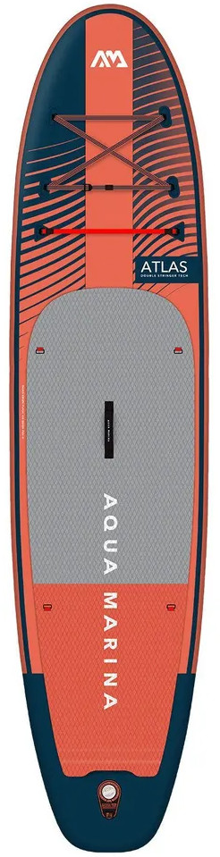 Одной из особенностей Aqua Marina Atlas является слегка увеличенное водоизмещение, что обеспечивает большую грузоподъёмность и устойчивость на воде, а также позволяет взять с собой больше вещей на борд. Aqua Marina Atlas изготовлена с использованием эксклюзивной запатентованной технологии Double Stringer Technology, которая обеспечивает хорошую жёсткость при лёгком весе доски (доска легче на 30% чем двухслойные и на 20% жёстче однослойной конструкции).Это даёт ощущения от управления, сравнимые с ненадувными моделями. SUP-доска со всеми аксессуарами легко складывается в стильный и комфортный водонепроницаемый рюкзак, что позволяет её взять с собой практически в любую поездку.