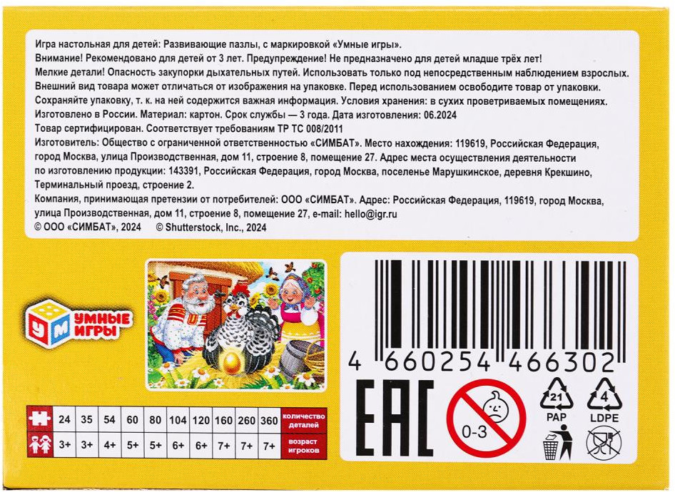 Классические пазлы в коробке «Русские сказки» ТМ «Умные игры» непременно понравятся маленьким любознайкам. Данный пазл представляет собой игру-головоломку, в которой необходимо в правильной последовательности соединить элементы друг с другом и получить в результате красочную картинку с изображением героев известной русской народной сказки. Сборка пазлов — это очень увлекательное занятие, в процессе которого дети учатся искать и совмещать детали разной формы, с каждым разом делая это всё лучше и быстрее. Собирая пазлы ТМ «Умные игры», ребёнок будет развивать: внимание, цветовое восприятие, логическое мышление, мелкую моторику и усидчивость. |