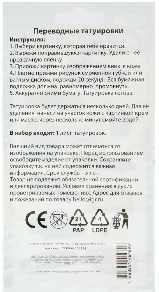 💳 Оплатить за товар можно при получении 🇰🇿 Есть бесплатная доставка по Казахстану от 1 дня 🎁 Копите бонусы с каждой покупки Переводные татуировки «Суперкары» ТМ «Мульти Арт» — отличный способ внести в свою внешность что-то новое и оригинальное: необычный дизайн и эффектное украшение для тела. При помощи этого набора можно украсить себя стильными картинками, которые легко смываются, безопасны для детей, а главное, их можно менять. Татуировки держатся несколько дней. Для их удаления необходимо нанести на участок кожи с картинкой крем или масло и смыть через несколько минут водой. |