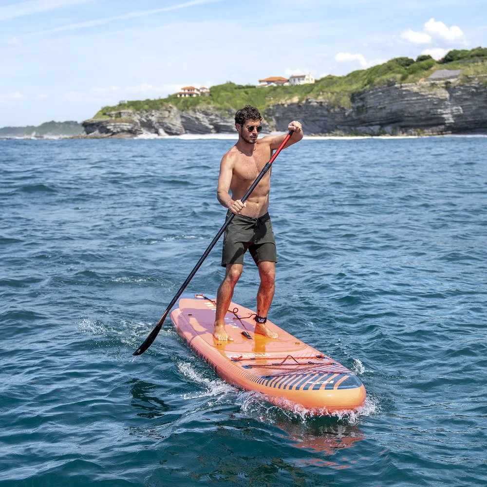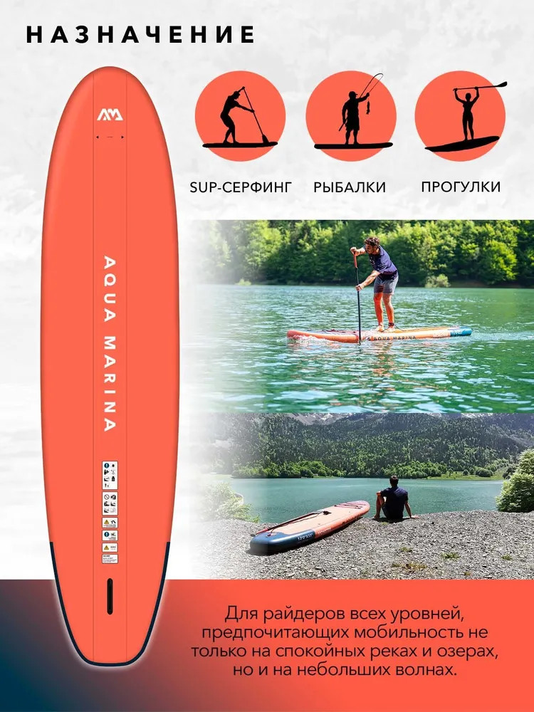 По периметру SUP-доски расположен защитный бампер из прочного армированного ПВХ с плотностью 1000 Den, который защищает камеру борда от ударов. Надежный клапан высокого давления с широкой резиновой крышкой гарантирует отличную герметичность и предотвращает утечку воздуха в процессе эксплуатации. Инновационная система крепления багажа Red Strap™ с двумя отдельными зонами шнуровки и удобной регулировкой на передней части доски позволяет взять с собой больше вещей, чем это возможно у других бордов этой ценовой категории. В сложенном состоянии SUP-доска «Aqua Marina» удивляет своей компактностью. Вместе со всеми аксессуарами она легко умещается в специальный водонепроницаемый рюкзак, идущий в комплекте, что избавляет от необходимости платить за перевозку крупногабаритного багажа. Это делает её идеальным выбором для путешествий, в том числе на дальние поездки.