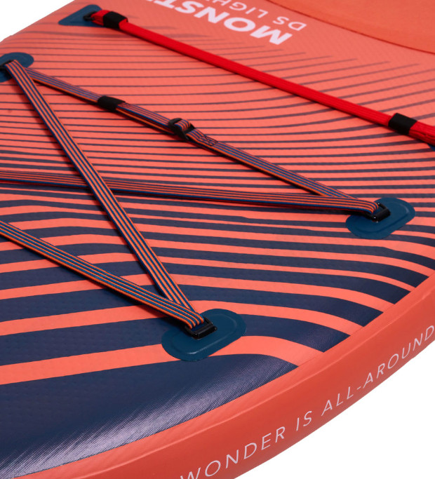 Поверхность доски покрыта износостойким слоем из EVA-пены с глубоким протектором, что позволяет надежно удерживаться на ней как с обувью для водных видов спорта, так и босиком. Прочное D-образное кольцо из анодированной стали предоставляет возможность крепления сиденья для длительных путешествий по спокойной воде или фиксации троса безопасности во время катания на морских волнах. «Monster Sky Glider» включает в себя уникальную технологию Drop Stitch Lite, благодаря которой доска на 20% легче традиционных сапбордов с Drop Stitch камерой. Эта технология внутренних камер борда обеспечивает прочность и жесткость конструкции, при этом вес доски составляет всего 10 кг, а грузоподъемность достигает 170 кг.