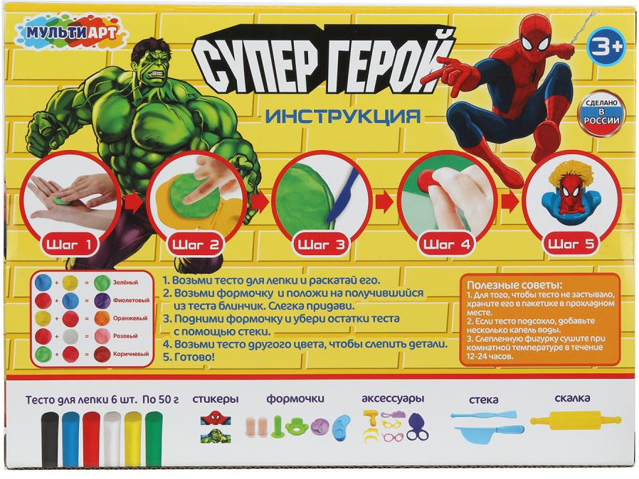 💳 Оплатить за товар можно при получении 🇰🇿 Есть бесплатная доставка по Казахстану от 1 дня 🎁 Копите бонусы с каждой покупки Набор с тестом для лепки и формочками «Супергерой» ТМ «Мульти Арт» — отличный вариант для развития творческих способностей ребёнка. Используя тесто из набора, малыш сможет увлекательно провести время, самостоятельно или при помощи родителей вылепливая интересные поделки и украшая любимых супергероев. А разнообразные формочки помогут им в этом и сделают игры с тестом ещё интереснее. |