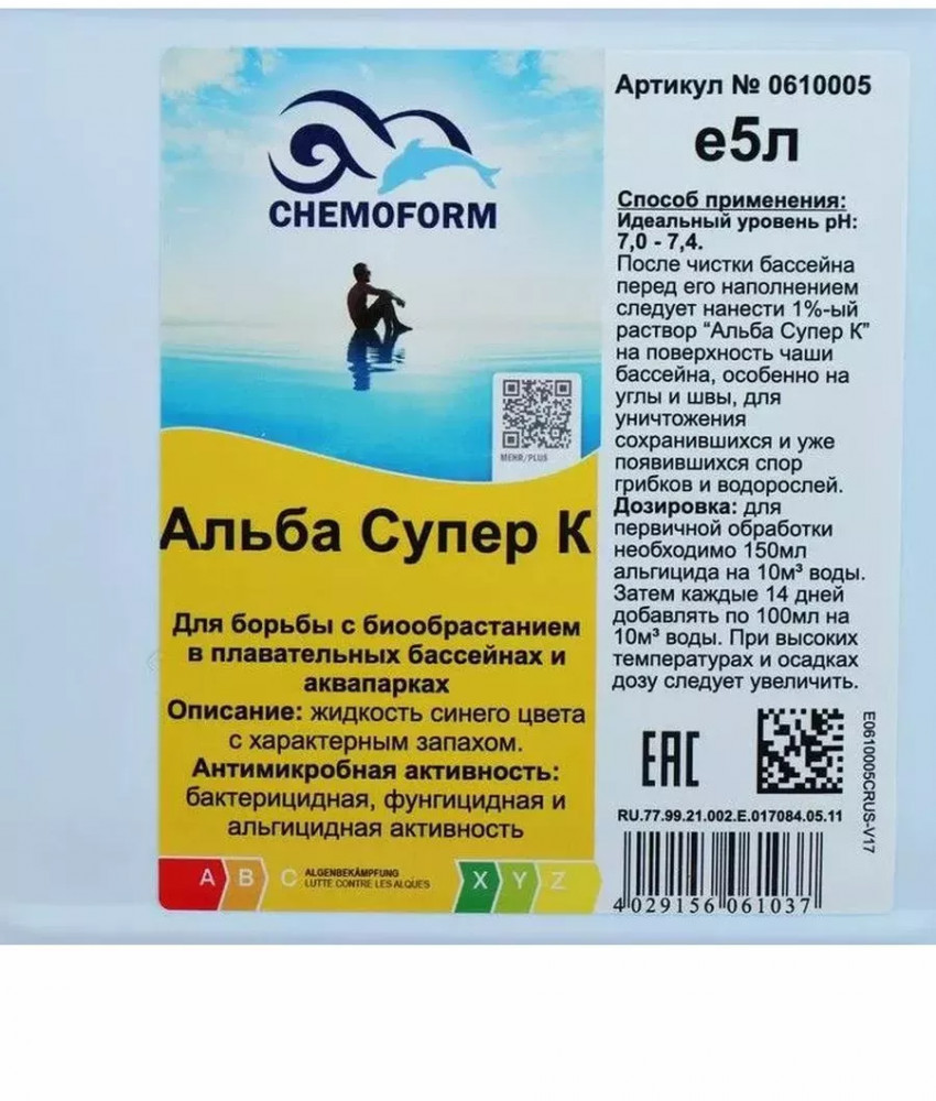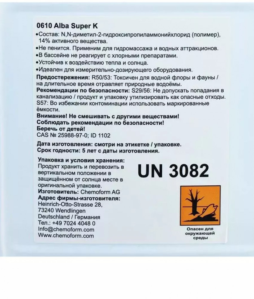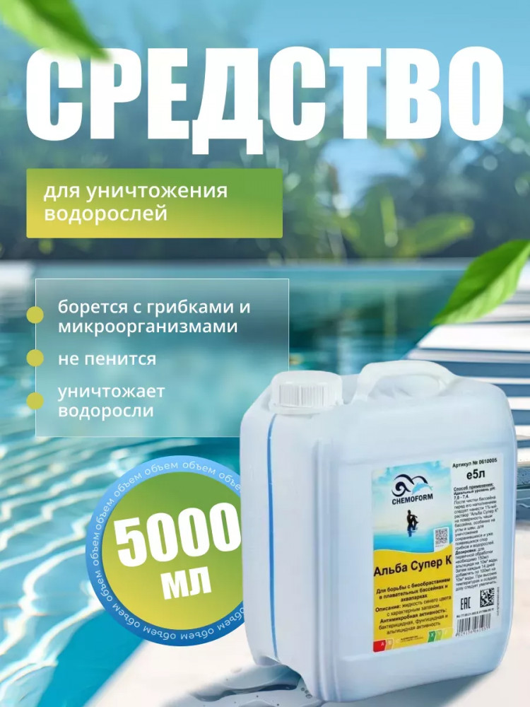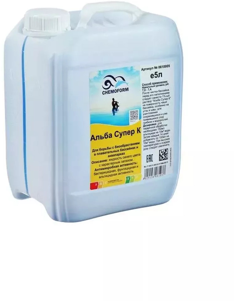 Быстродействующее эффективное средство для борьбы с позеленением воды плавательного бассейна, вызываемым водорослями. Часто в плавательном бассейне возникает такое неприятное явление, как позеленение воды, вызываемое микроскопическими водорослями, активно размножающимися в летний период. При несвоевременном устранении позеленения воды колонии водорослей могут обширно разрастаться на стенках бассейна. Для борьбы с водорослями служат специальные препараты — альгициды, активно уничтожающие как сами водоросли, так и их споры. Chemoform «Альба Супер К» — это концентрированный (14%) жидкий непенящийся альгицид. Препарат хорошо сочетается со средствами на основе активного кислорода и обладает рядом других преимуществ.