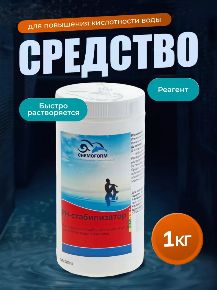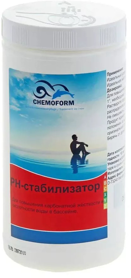 PH-стабилизатор от производителя Chemoform предназначен для повышения содержания кислоты в воде плавательного бассейна. Повышает общую щелочность воды бассейна на основе солей гидрокарбоната натрия. Растворяется быстро и без остатка. Обладает качеством пищевого продукта. Без содержания хлорида. Осуществлять хранение препарата следует в сухом прохладном и хорошо вентилируемом помещении в герметично закрытой заводской упаковке. Не подвергайте смешиванию с другими химическими препаратами. Избегайте попадания препарата в окружающую среду.