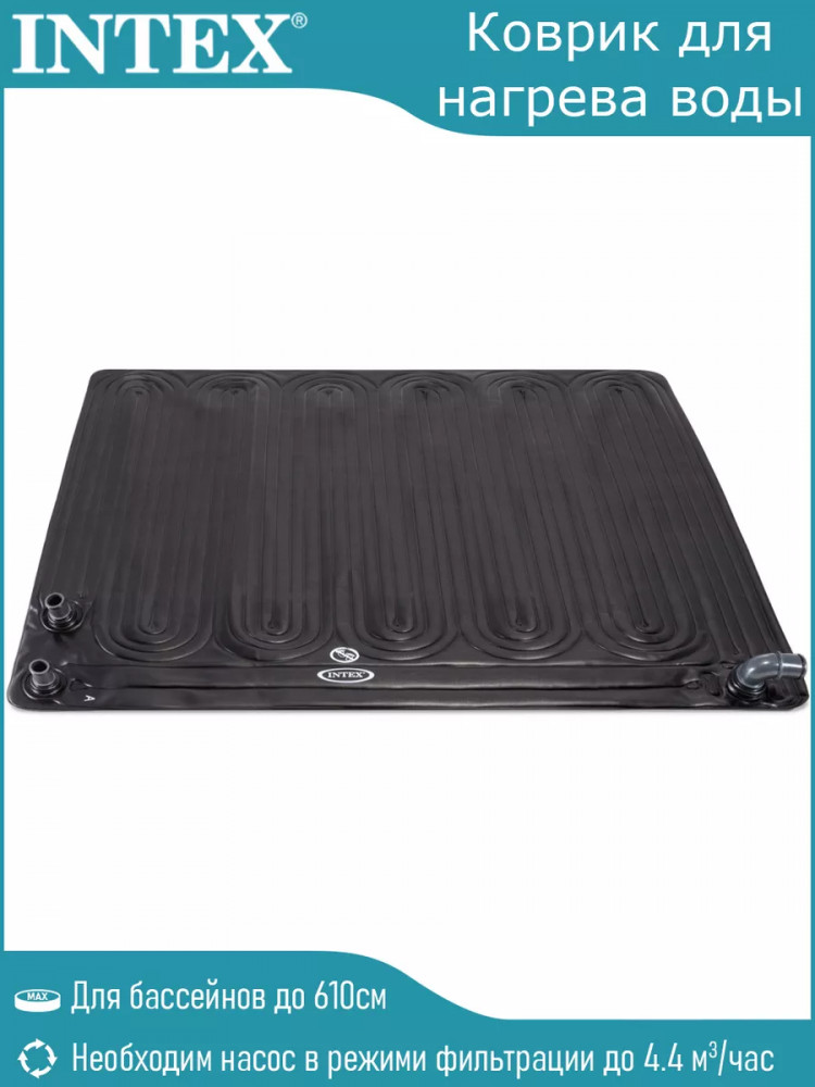Коврика для нагрева воды Intex 28685 может создать в вашем бассейне комфортную для купания атмосферу. Изделие черного цвета необходимо последовательно подключить после насоса фильтрующего типа. В комплекте идут переходники для подключения к отверстиям, диаметр которых составляет 38 мм и 32 мм. Возможно нагреть воду на 3 — 5 градусов. Все зависит от температуры воздуха и воздействия солнца. Если бассейн большой, стоит подключить к нему не один нагреватель, а несколько. Габариты полотна водонагревателя 1208120 см. можно использовать с фильтр насосами, производительность которых составляет 9500 литров в час.