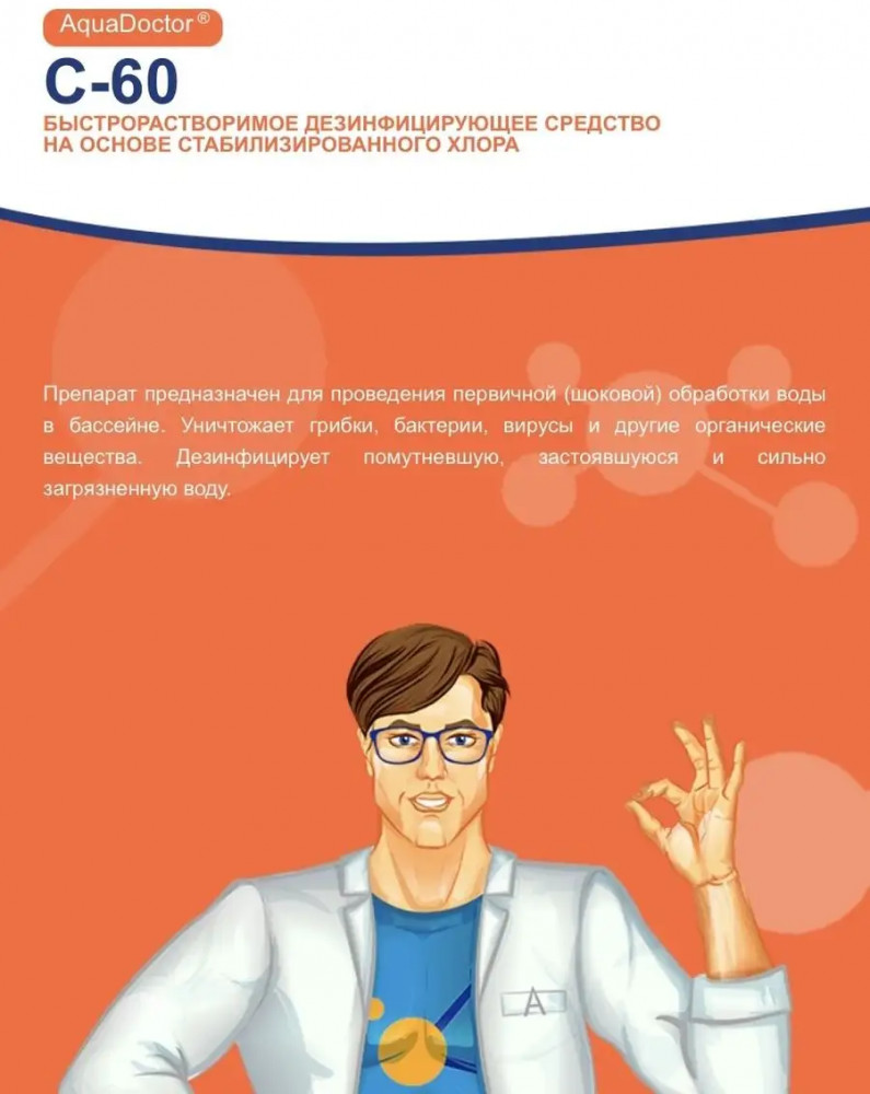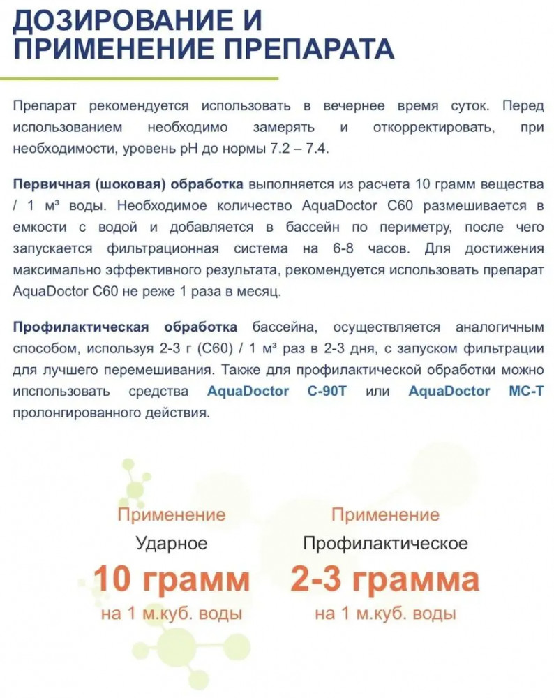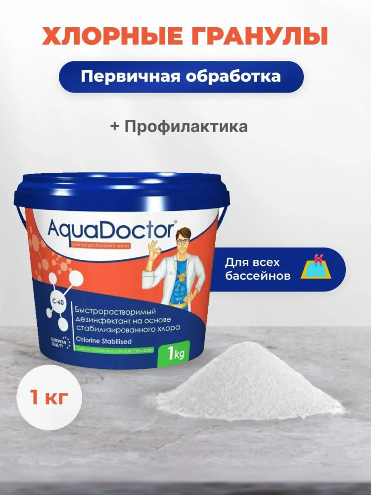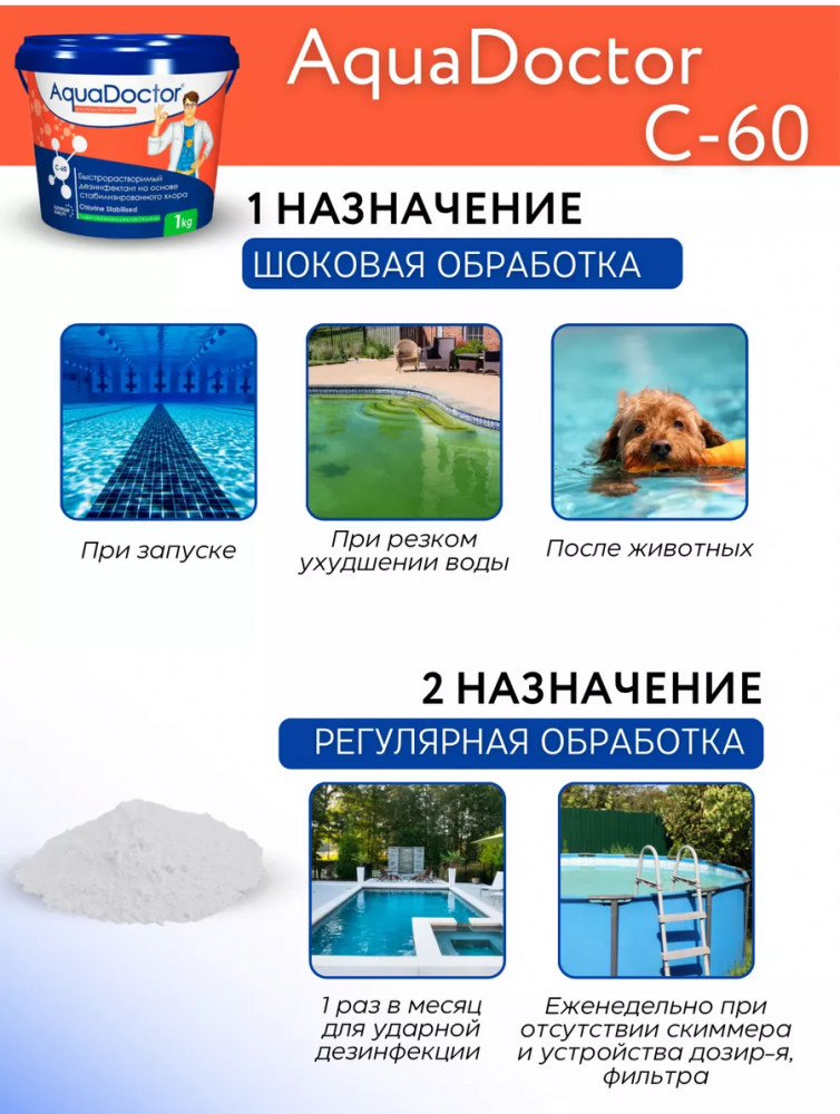 Аквадоктор С60 — это химия для бассейнов в виде гранул. Предназначается для регулярной обработки воды бассейна. В данном случае дозировка значительно меньше, чем при ударной обработке. Гранулы предварительно растворяются в отдельной емкости (иначе покрытие бассейна можно обесцветить) и разливается по периметру бассейна. При наличии фильтрации бассейна необходимо ее включить.