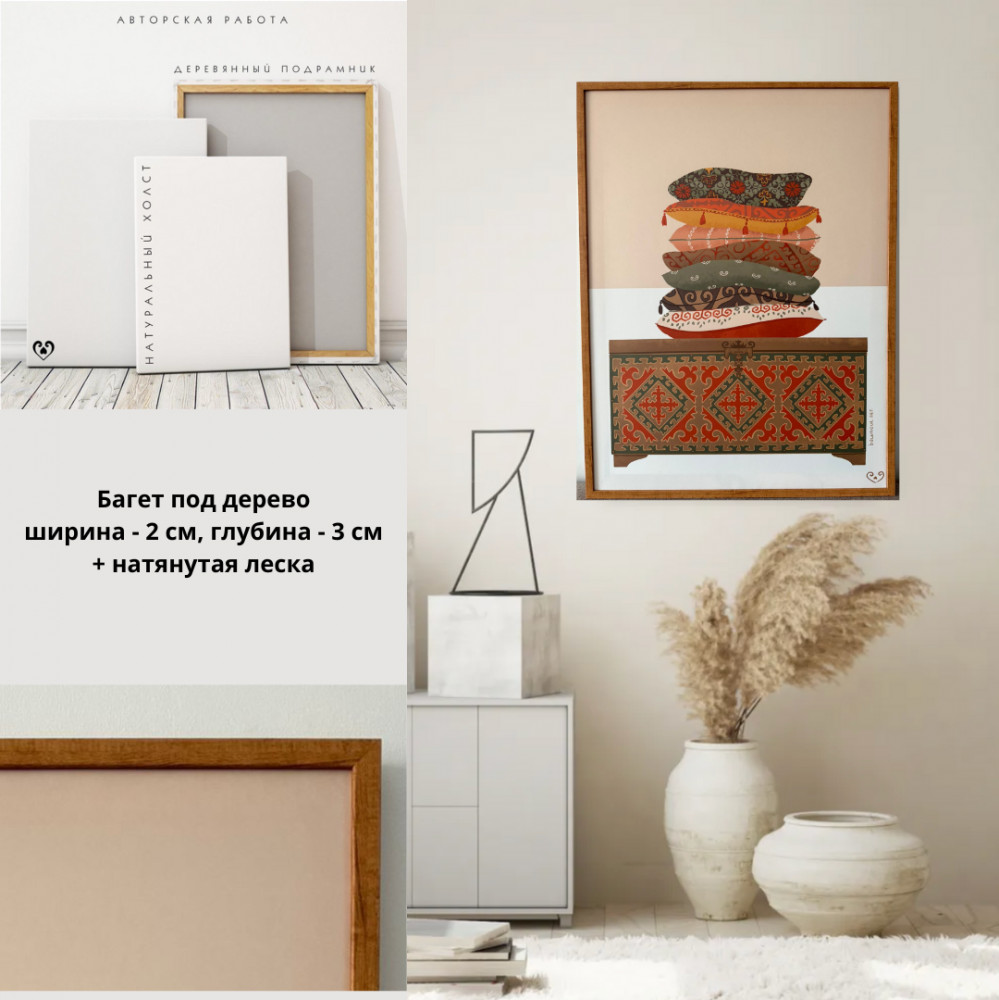 💳 Оплатить за товар можно при получении 🇰🇿 Есть бесплатная доставка по Казахстану от 1 дня 🎁 Копите бонусы с каждой покупки Картина на холсте в классическом багете под дерево «Sandyq» формата 60×80 см. Картины для вашего дома в спальню, в гостиную или на кухню. Авторские интерьерные картины от Balamour.art отлично впишутся в любой интерьер и создадут дополнительный уют в вашем доме. Холст — это полотно, натянутое на деревянный подрамник. Основными преимуществами печати на холсте является долговечность, текстурированная поверхность и цветопередача. Готовая работа выглядит как картина, нарисованная от руки. К холсту отдельно изготавливается специальная рама (багет), ширина которого составляет 2 см. Материал — пластик. Сзади подрамника крепится специальная леска, с помощью которой вы можете повесить картину на стену. |