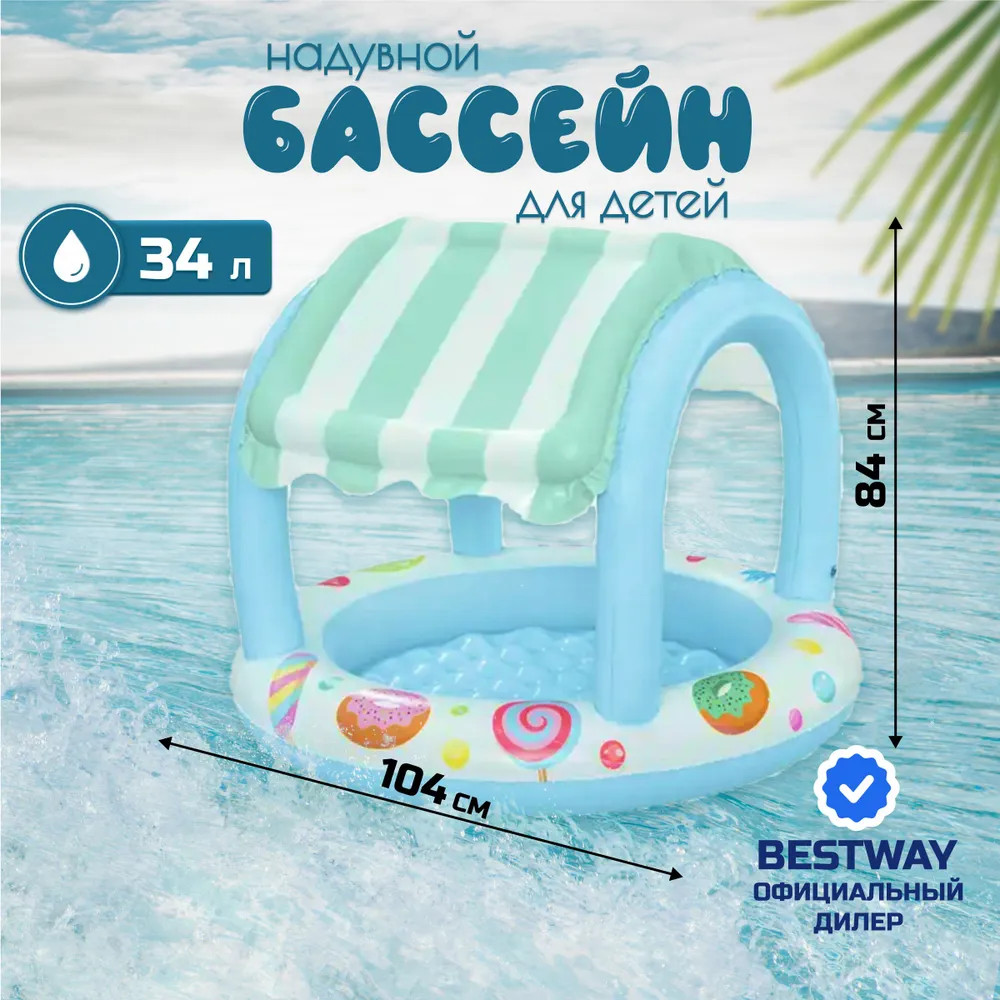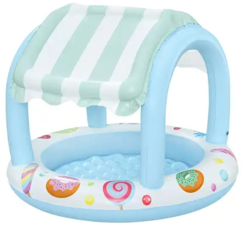 В изделии предусмотрены комфортные широкие бортики, дети могут плавать и греться на солнце, не выходя из него. Надувной детский мини бассейн бренда Bestway Sweet Shoppe — это идеальная модель с навесом для малышей от 2 лет. Навес от солнца будет служить тентом для защиты ребенка от палящих лучей.