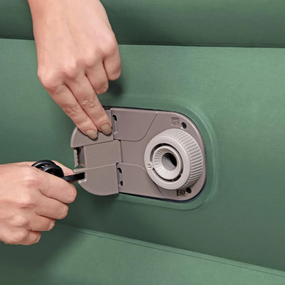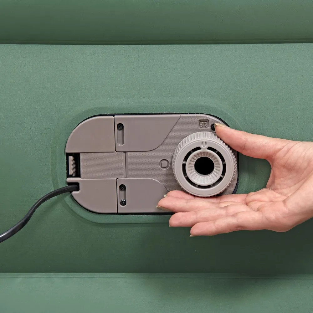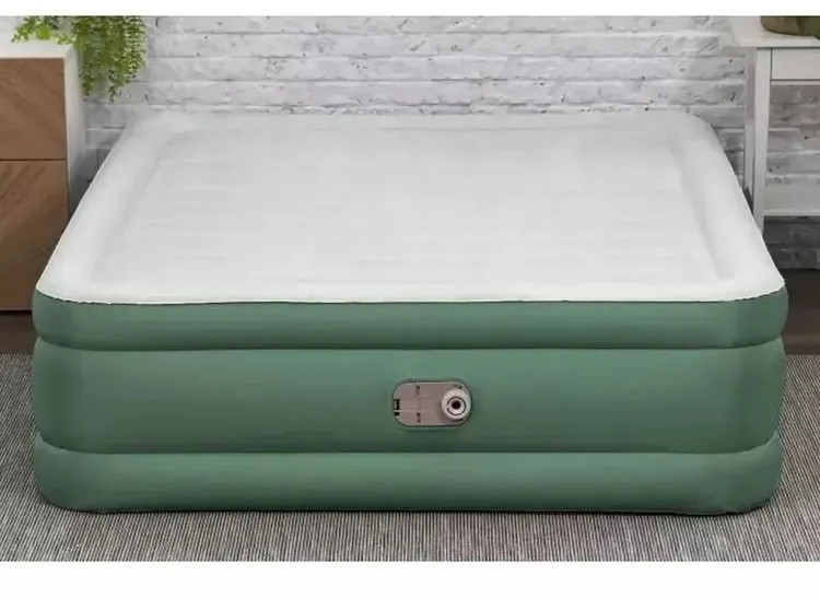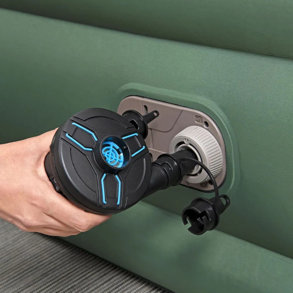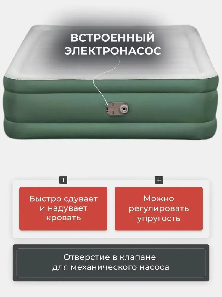 Кровать поставляется со встроенным электронасосом, который позволяет за несколько минут надувать и сдувать кровать, а также дает возможность отрегулировать ее жесткость. Встроенный насос подключается к стандартной электрической розетке. При отсутствии электричества, кровать можно накачать обычным механическим насосом. Для этого кровать снабжена специальным клапаном для подключения внешнего насоса. В комплект входит удобная сумка для переноски кровати и специальная самоклеящаяся заплатка.