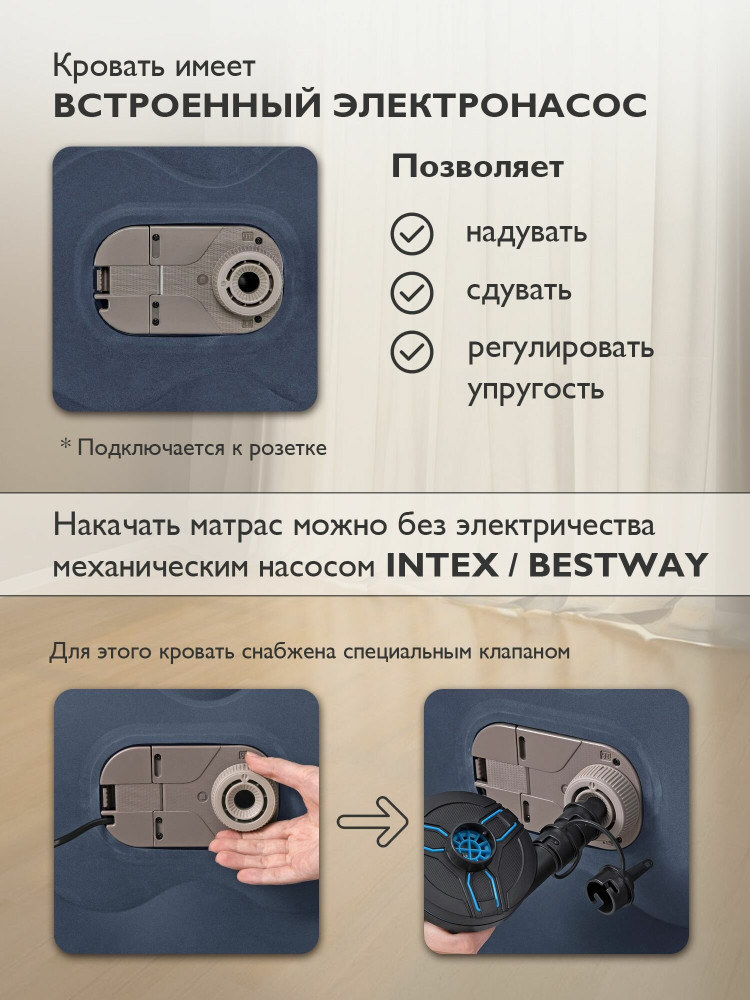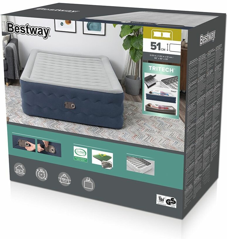 Bestway Кровать надувная со встроенным электронасосом «Tritech»В данный момент этот товар отсутствует в продаже. Возможно, у нас найдется аналогичный или похожий товар здесь. Двуспальная надувная кровать Bestway 6716P «Tritech» + насос (152×203×51 cм). Двухместная надувная кровать Bestwa TriTech Double TruLeisure с антимикробной поверхностью и встроенным электрическим насосом обеспечивает максимальный комфорт и качество сна. При размерах 203×152×51 см двуспальная надувная кровать обеспечивает достаточно места для комфортного сна двух человек. Высококачественная внутренняя конструкция Wave Beam обеспечивает удобное для спины распределение веса, а оборачиваемая вокруг рамы конструкция предотвращает скатывание и повышает устойчивость. Материал TriTech, из которого изготовлена надувная кровать, отличается высокой прочностью и износостойкостью. Материал намного прочнее традиционного ПВХ, что обеспечивает долговечность использования. Надувной матрас идет с высококачественной поверхностью Ultra-Fresh, что предотвращает развитие бактерий, вызывающих неприятный запах, плесени и грибка. Благодаря этому надувная кровать дольше сохраняет свежесть и гигиеничность. Надувная кровать очень проста в установке: встроенный электрический насос 220-240 В позволяет быстро и легко надуть кровать всего за 5 минут. Это экономит время и силы и делает надувную кровать готовой к использованию в любое время. |