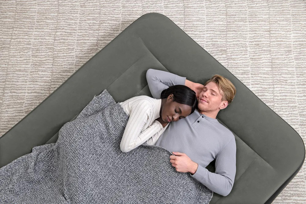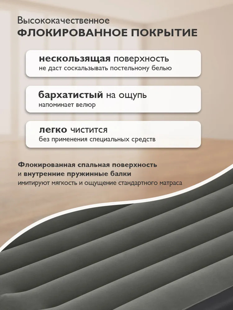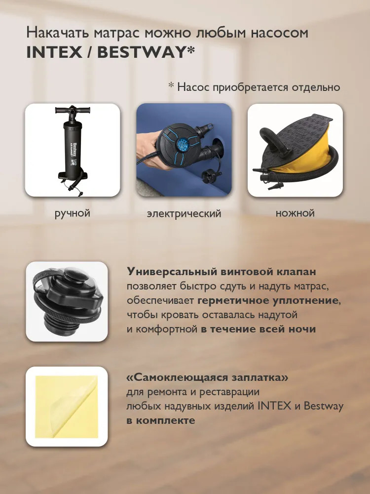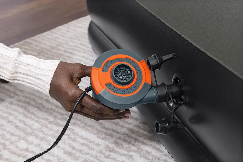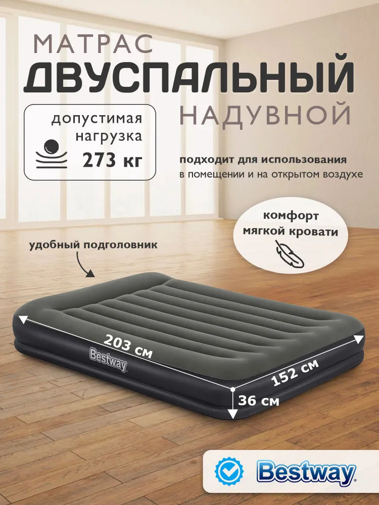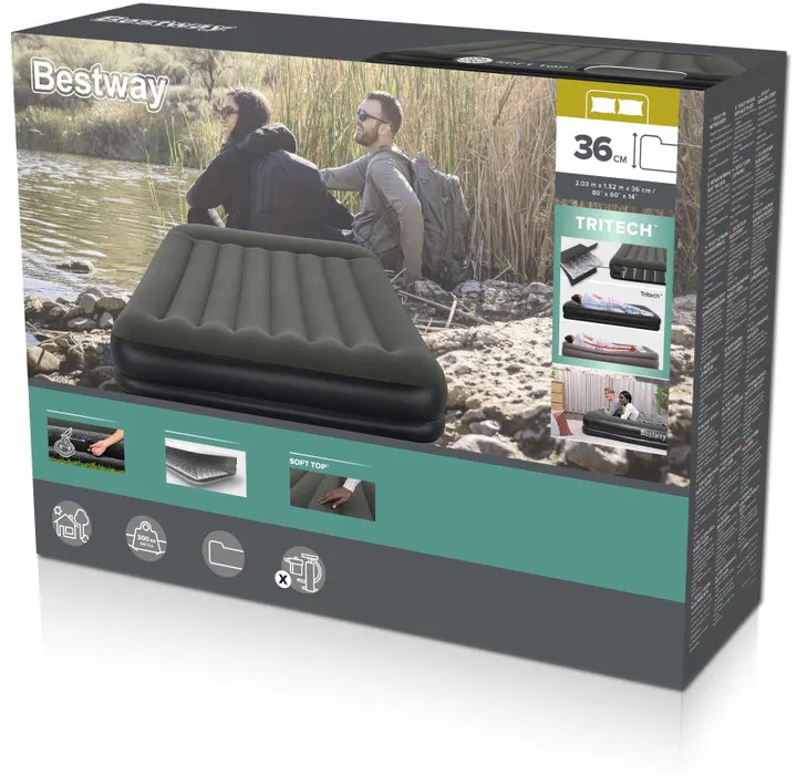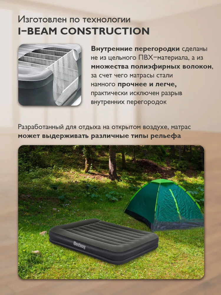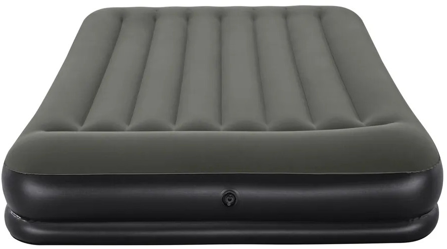 Двуспальная надувная кровать серии Tritech Airbed изготовлена по технологии I-Beam Construction. Внутренние перегородки под весом тела не деформируются и постоянно остаются устойчивыми. Вес распространяется равномерно по всей площади надувной кровати. Приятное флокированное покрытие поверхности кровати, которое напоминает велюр, не даст соскальзывать постельному белью и покрывалам, легко чистится без применения специальных средств. Кровать можно накачать любым электрическим или механическим насосом производителя. Для этого кровать снабжена специальным клапаном для подключения внешнего насоса.