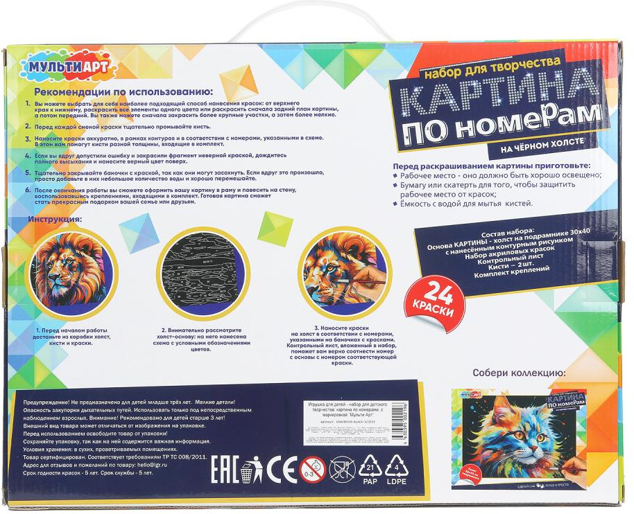 💳 Оплатить за товар можно при получении 🇰🇿 Есть бесплатная доставка по Казахстану 🎁 Копите бонусы с каждой покупки Набор для творчества — картина по номерам «Лев» ТМ «Мульти Арт» — отличный подарок для маленького художника. |