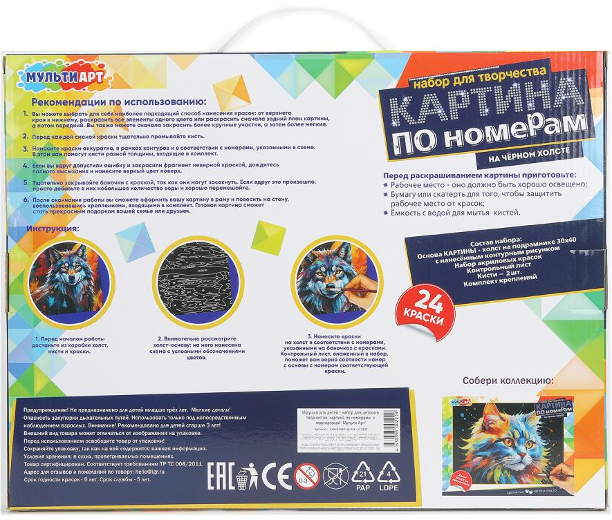 💳 Оплатить за товар можно при получении 🇰🇿 Есть бесплатная доставка по Казахстану 🎁 Копите бонусы с каждой покупки Набор для творчества — картина по номерам «Волк» ТМ «Мульти Арт» — отличный подарок для маленького художника. |