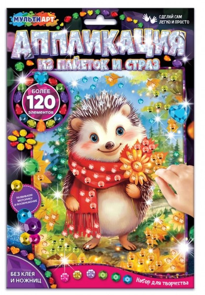 Набор для творчества — аппликация из пайеток и страз «Осенний ёжик» ТМ «Мульти Арт» — отличный подарок для вашего ребёнка, который будет способствовать развитию его творческих способностей. С помощью этого набора юный художник сможет самостоятельно создать сверкающую аппликацию с изображением очаровательного ёжика. Готовую поделку можно подарить близким или использовать для украшения интерьера.