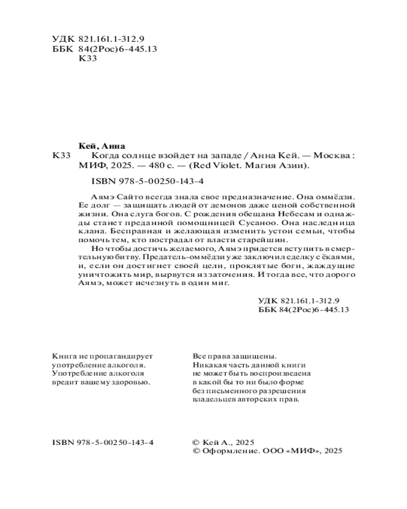 💳 Оплатить за товар можно при получении 🇰🇿 Есть бесплатная доставка по Казахстану от 1 дня 🎁 Копите бонусы с каждой покупки Серия: Red Violet. Магия Азии Аямэ Сайто всегда знала свое предназначение. Она оммёдзи. Ее долг — защищать людей от демонов даже ценой собственной жизни. Она слуга богов. С рождения обещана Небесам и однажды станет преданной помощницей Сусаноо. Она наследница клана. Бесправная и желающая изменить устои семьи, чтобы помочь тем, кто пострадал от власти старейшин. Но чтобы достичь желаемого, Аямэ придется вступить в смертельную битву. Предатель-оммёдзи уже заключил сделку с ёкаями, и, если он достигнет своей цели, проклятые боги, жаждущие уничтожить мир, вырвутся из заточения. И тогда все, что дорого Аямэ, может исчезнуть в один миг. |