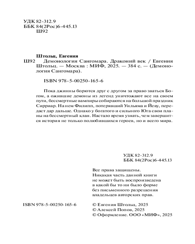 💳 Оплатить за товар можно при получении 🇰🇿 Есть бесплатная доставка по Казахстану от 1 дня 🎁 Копите бонусы с каждой покупки Серия: Демонология Сангомара Пока джинны борются друг с другом за право зваться Богом, а ожившие демоны из легенд уничтожают все на своем пути, бессмертные вампиры собираются на большой праздник Сирриар. На нем Филипп, потерявший Уильяма и Йеву, передаст дар дальше. Однако у богатого и сильного Юга свои планы на бессмертный клан. Настало время узнать, чем завершится история не только полюбившихся героев, но и всего мира. |