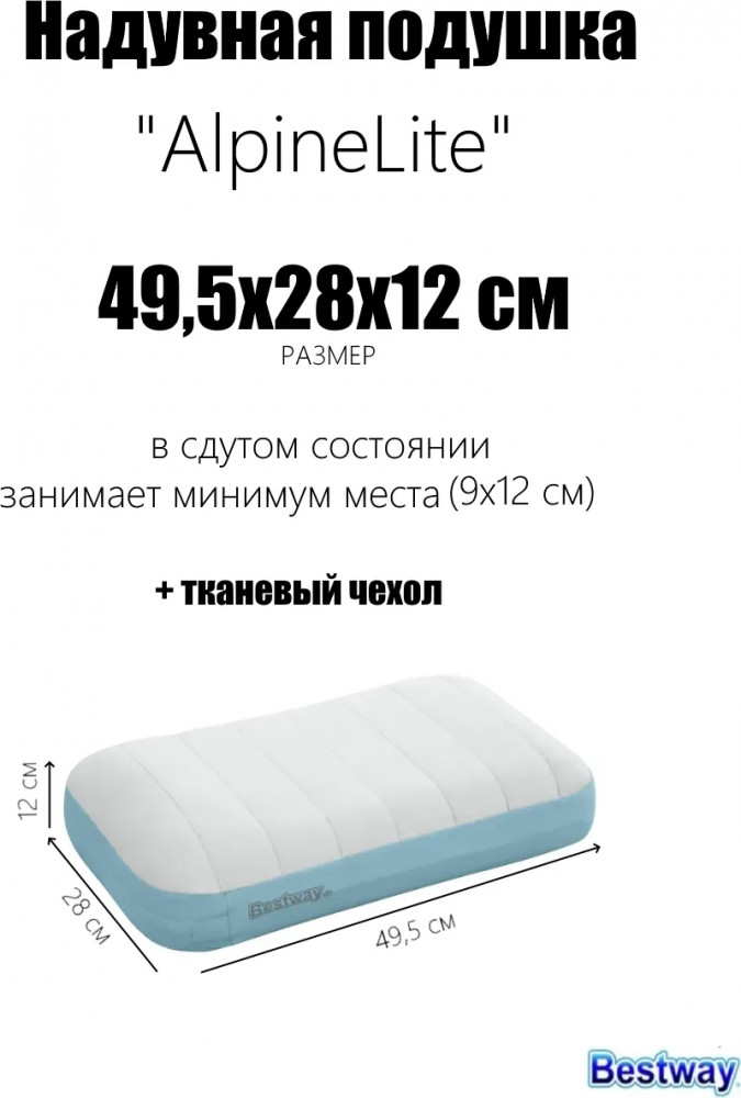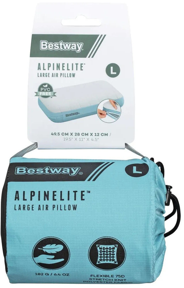 Надувная подушка Bestway Alpine lite размером 49,5×28×12 см обеспечивает первоклассный комфорт во время сна. При весе всего 182 г и компактном размере упаковки 9×12 см туристическая подушка для шеи очень легкая и удобная. Ее можно легко убрать в дорожную сумку. Благодаря сочетанию прочного на разрыв материала ToughLite и мягкого, гибкого полиэстера 75D stretch она обеспечивает исключительный комфорт. В походе или путешествии аксессуар обеспечит спокойный и комфортный сон. Внешний текстильный чехол можно снять для чистки. Плоский клапан позволяет быстро надуть подушку и легко отрегулировать давление, чтобы быстро достичь желаемого комфорта. В комплект входит не только удобная туристическая подушка, но и практичная сумка для хранения.